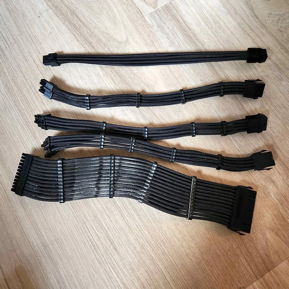 Set of cable extensions for PC. Includes a 24-pin, 2 x 8-pin PCIe, an 8-pin CPU and 6-pin PCIe. Has 4 spacing combs for each cable except the 6-pin which is missing its combs.