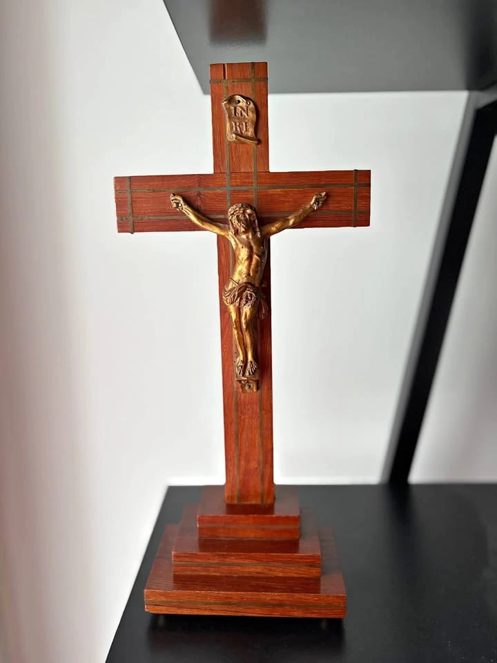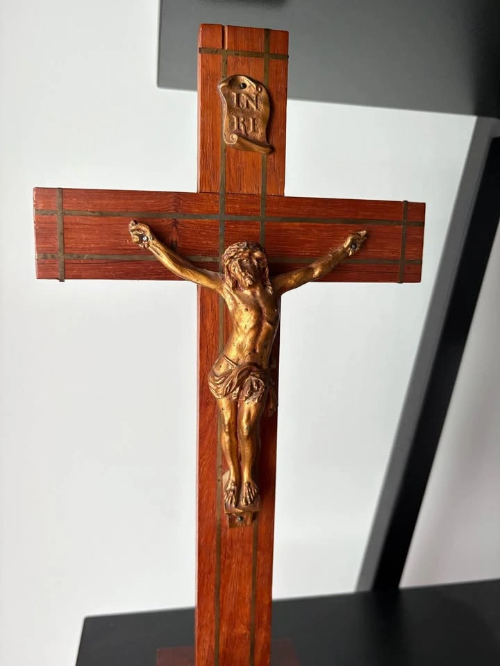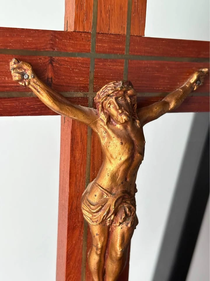 Vintage Standing Crucifix Rich Wood Brass Inlay