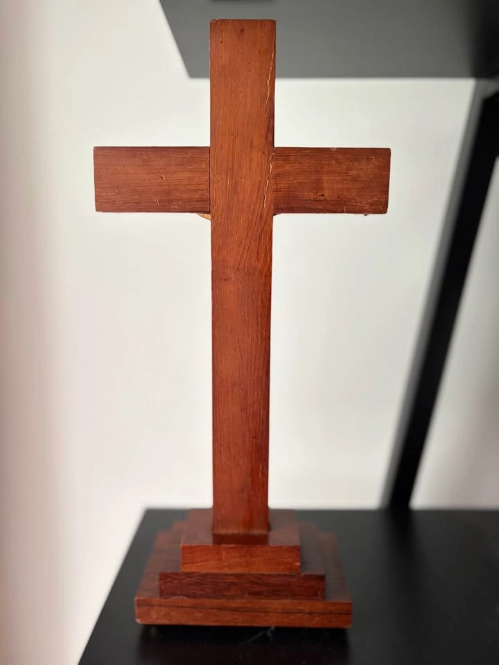 65This vintage wooden altar crucifix is a religious collectible that exudes a sense of tradition and spirituality. Stands on a tiered base. Crafted from wood and brass inlay. Excellent condition! 13.5”H 6.2”W Asking $50 or best offer. Pick up in Brighton! Check my other listings for deals and bundles! 🙂
