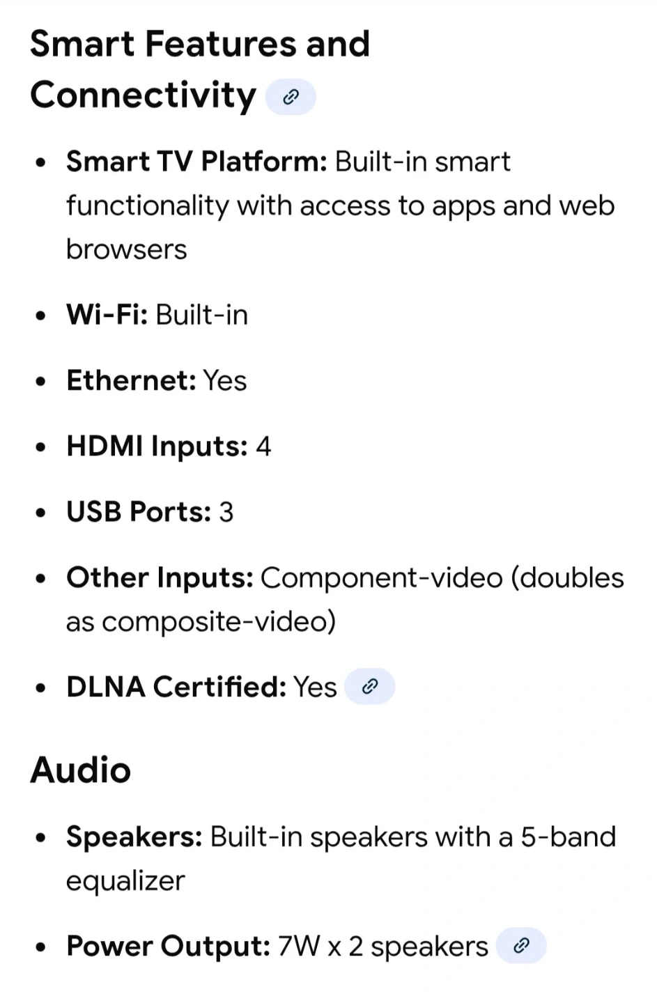 with an AquoMotion 120 refresh rate and HDR10 support. Key features include built-in Wi-Fi, 4 HDMI ports, 3 USB ports, and 14W (7W x 2) audio output with a 5-band equalizer.