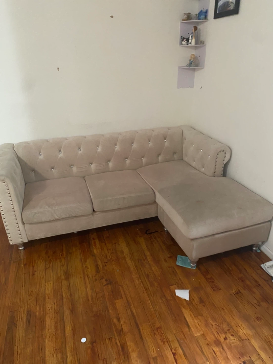 Selling a beige tufted sectional sofa that could be a great addition to your living space! It features a chaise lounge on one side and classic button tufting for a touch of elegance. The sofa shows some signs of use, but it's still comfortable and stylish