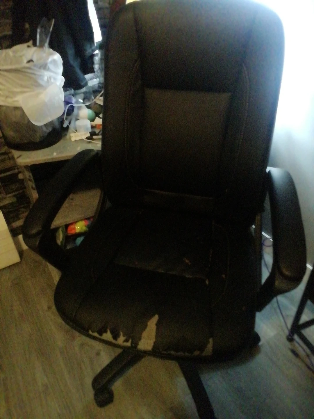 39Selling a black office chair. It's in used condition, with some wear and tear on the seat as shown in the picture. But it Still functions perfectly fine! Works incredible though You could just put a mat or something on the chair if it bothers u to much