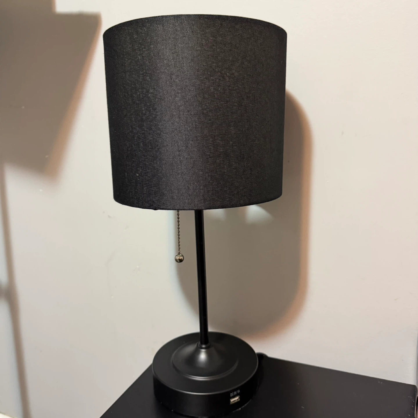 Selling a black table lamp in great condition! It's perfect for a bedside table or desk. The lamp features a pull chain switch and a fabric shade. It also has a base with USB ports for charging your devices. 3 modes - cool to warm. Philips bulb included.