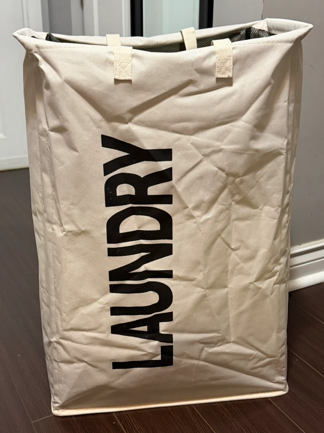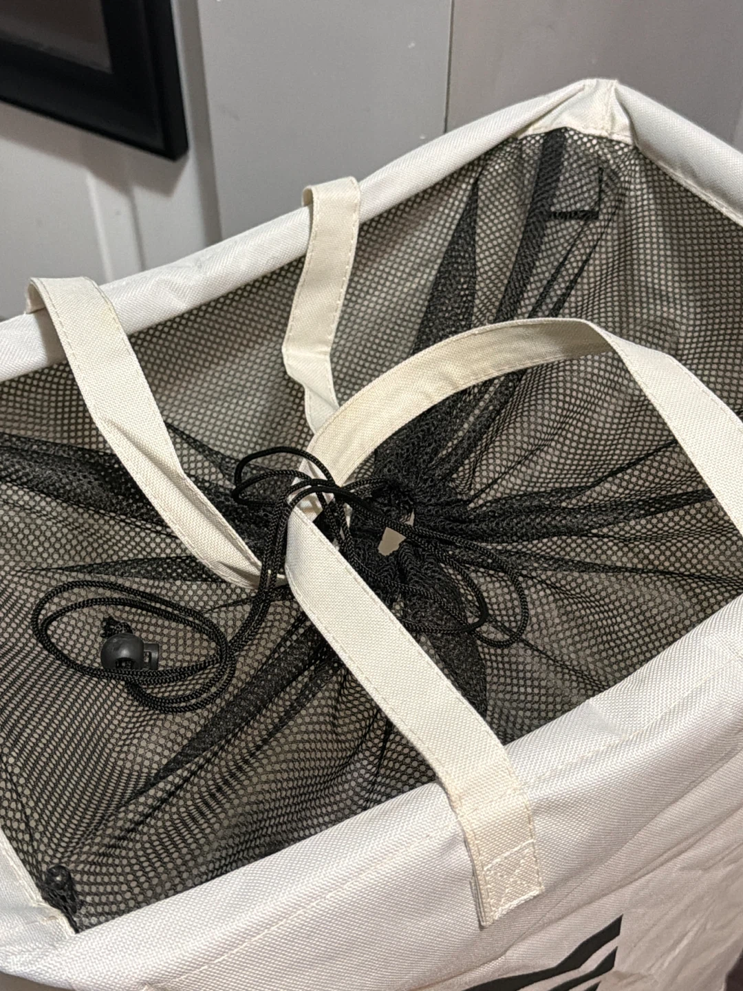 Laundry bag in great condition! It's a nice neutral colour and has handles for easy carrying. The top has a mesh cover with a drawstring to keep everything in place. Perfect for keeping your space tidy!