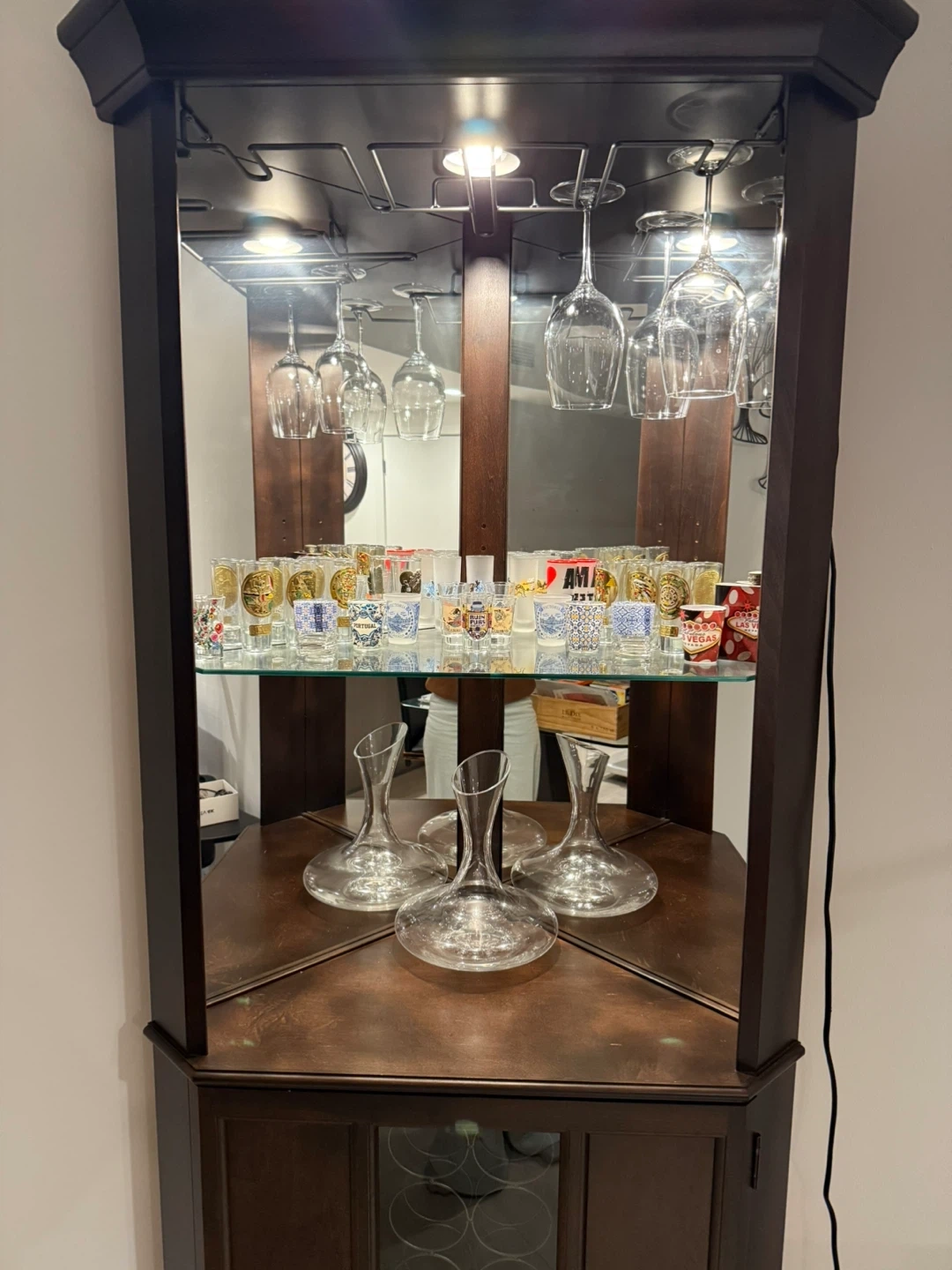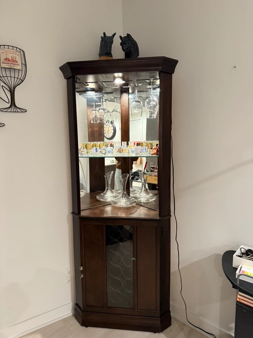 Selling a Piedmont III Corner Wine Cabinet in great condition! It's perfect for displaying your favourite glasses and spirits. It has a mirrored back and a built-in wine rack.