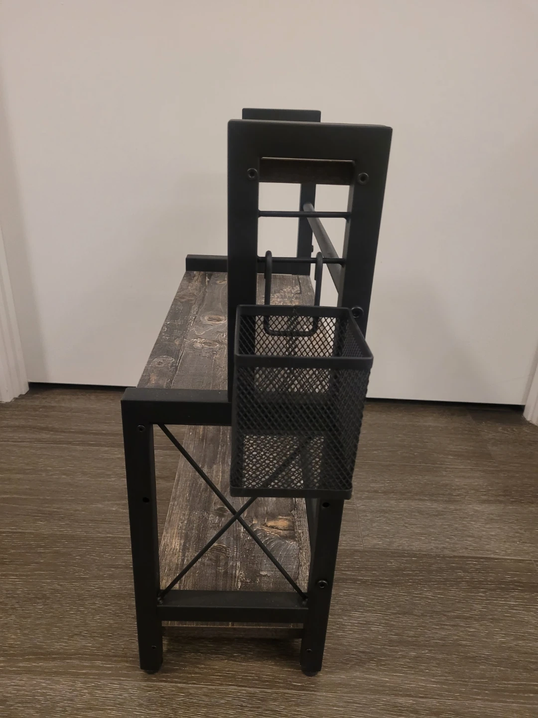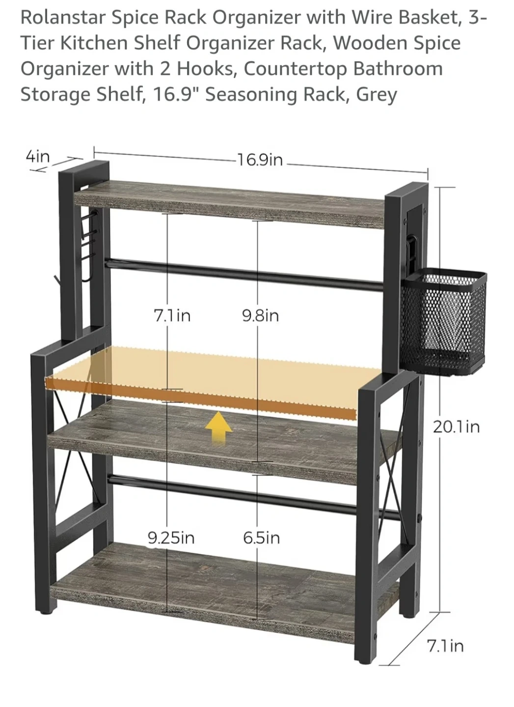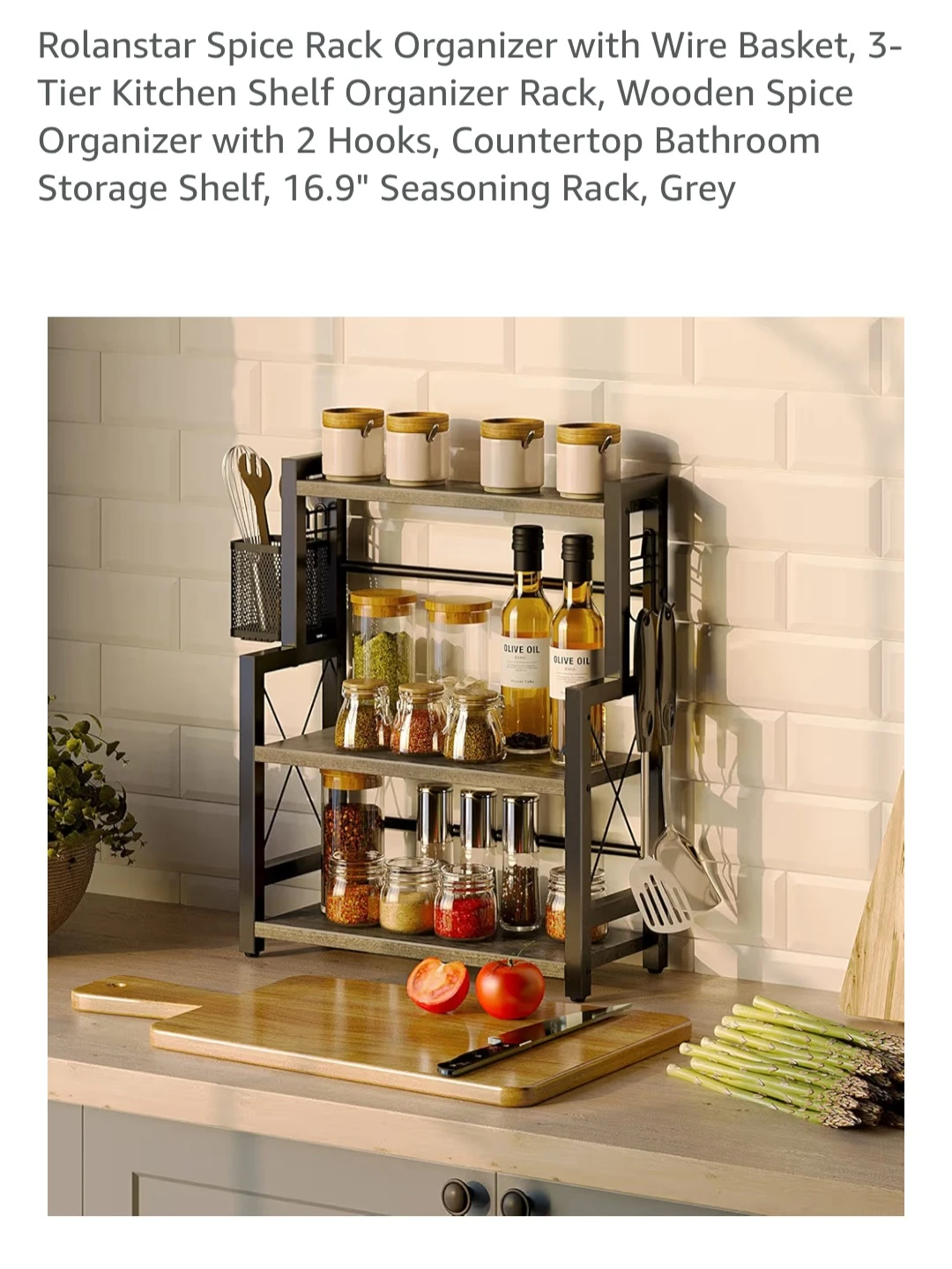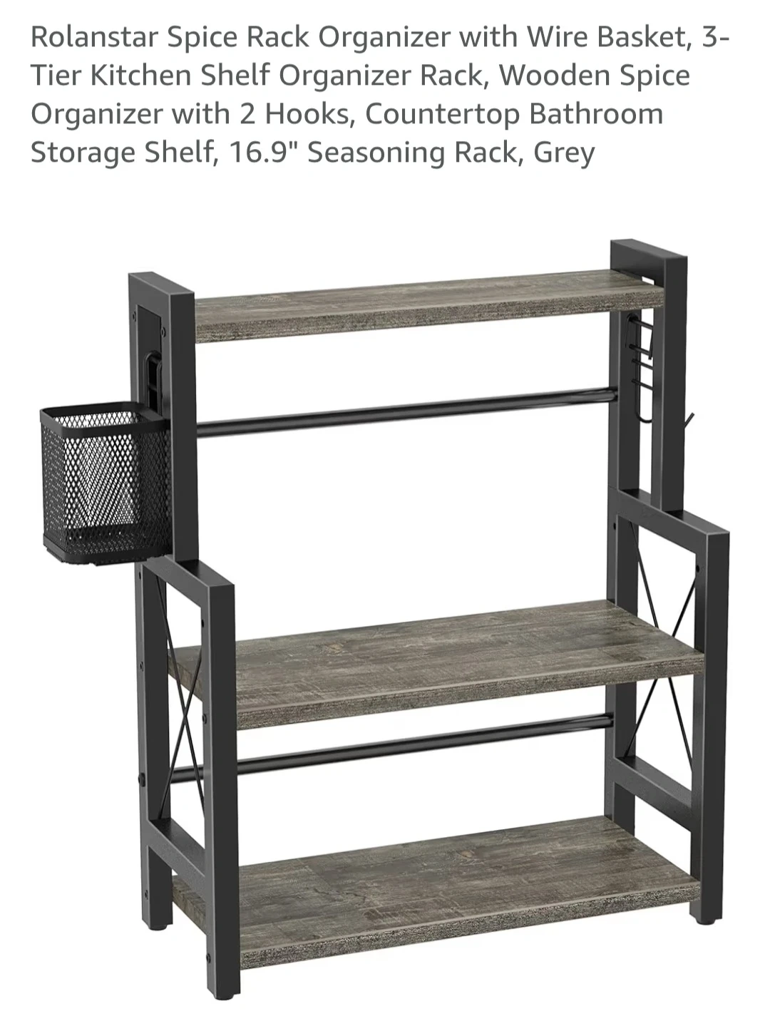 I'm selling a 3-tier kitchen spice rack with a wire basket! This shelf organizer has a wooden spice storage shelf and comes with two hooks.