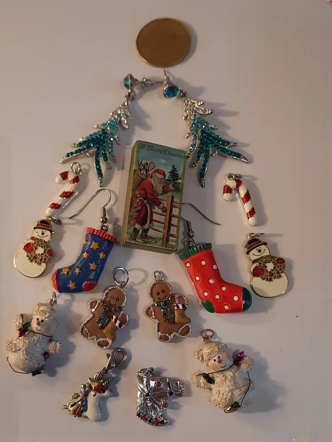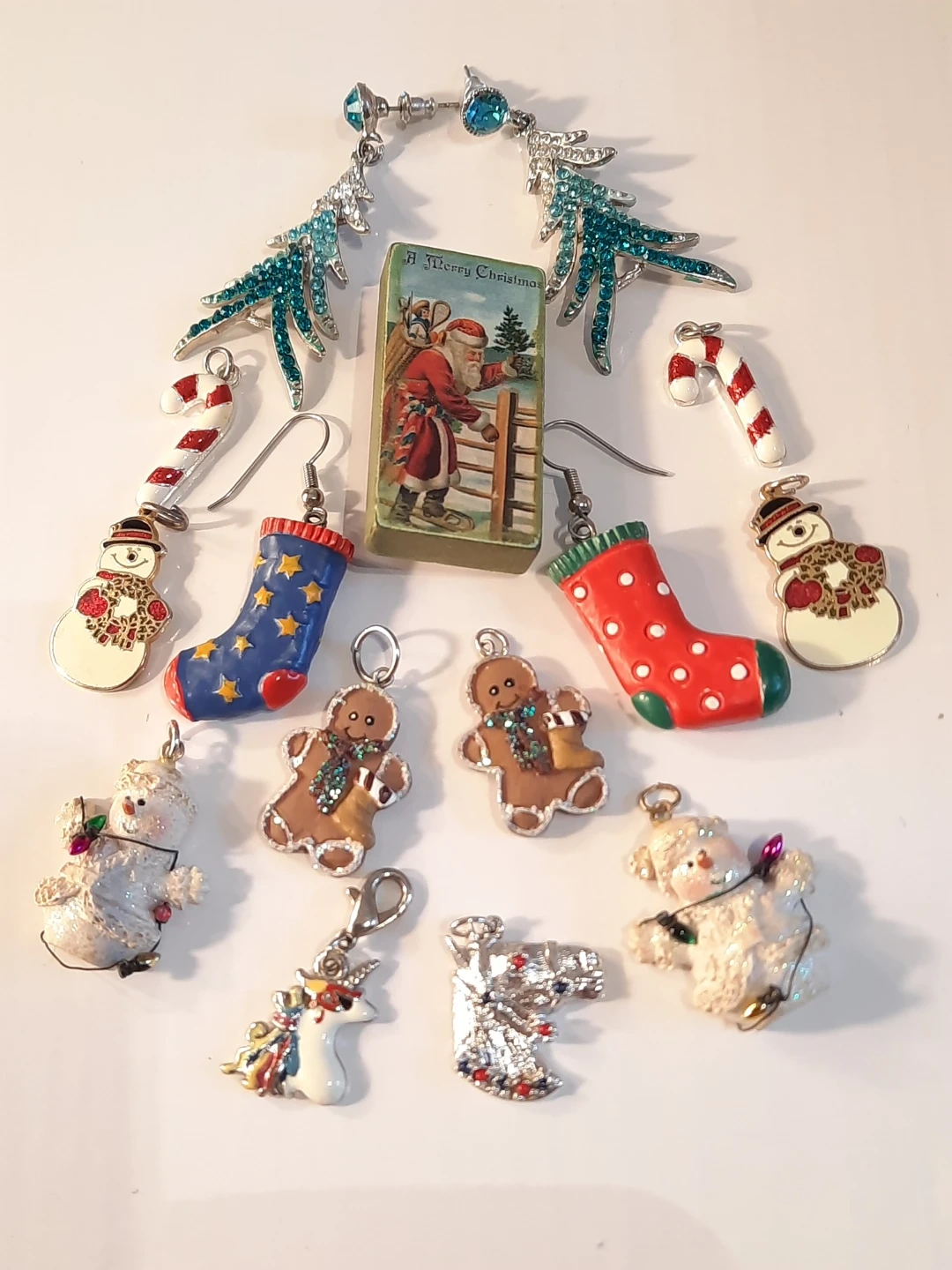 Selling a collection of assorted Christmas-themed charm earrings! There are gingerbread men, snowmen, Christmas trees, stockings, and more. Perfect for adding a festive touch to your holiday outfits!one earing missing one tiny stone ,eassy fix