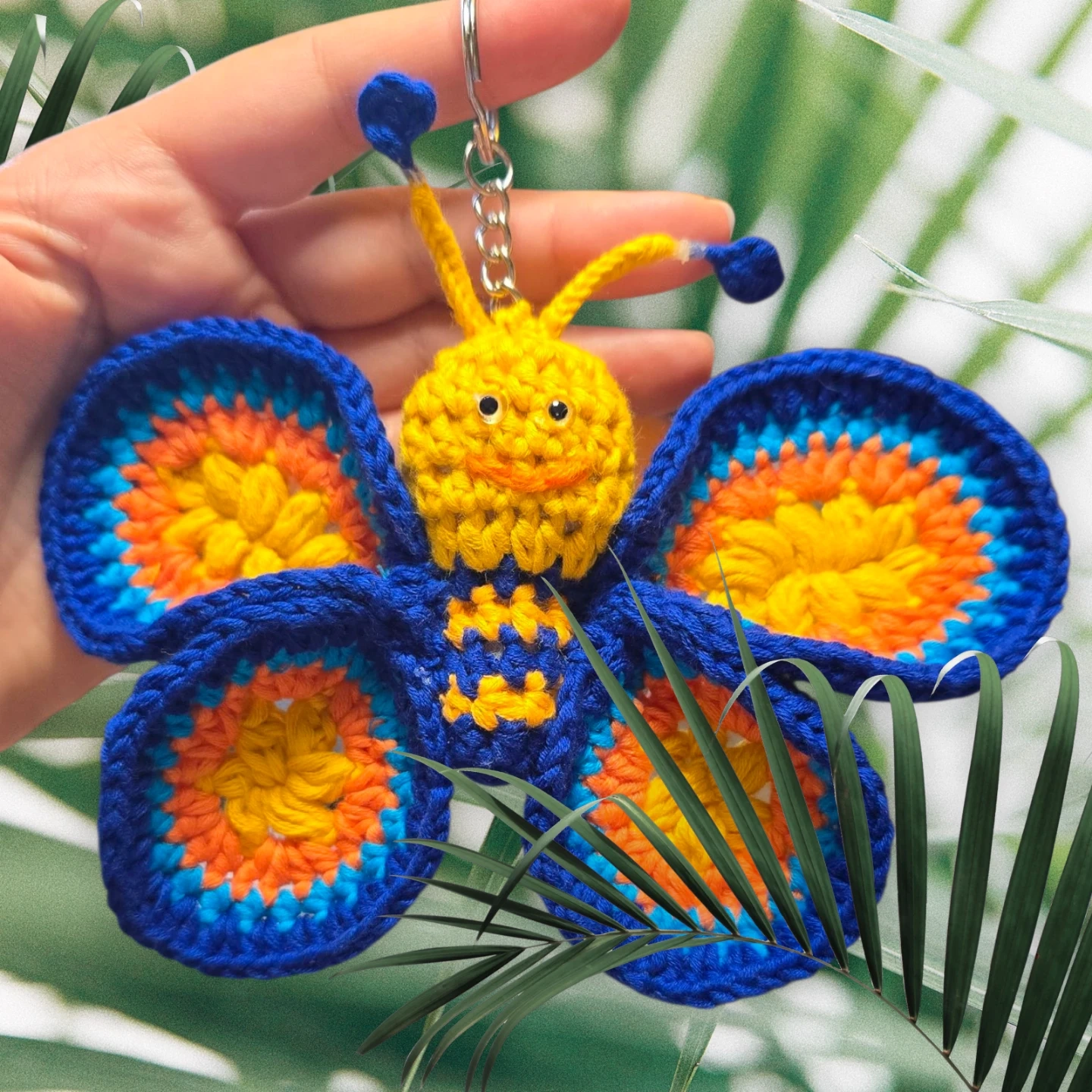 This is a handmade crochet butterfly keychain. It's a colorful and unique accessory that you can use for your keys or bag. The butterfly is made with blue, orange, and yellow yarn. Size: 6in h4.5in