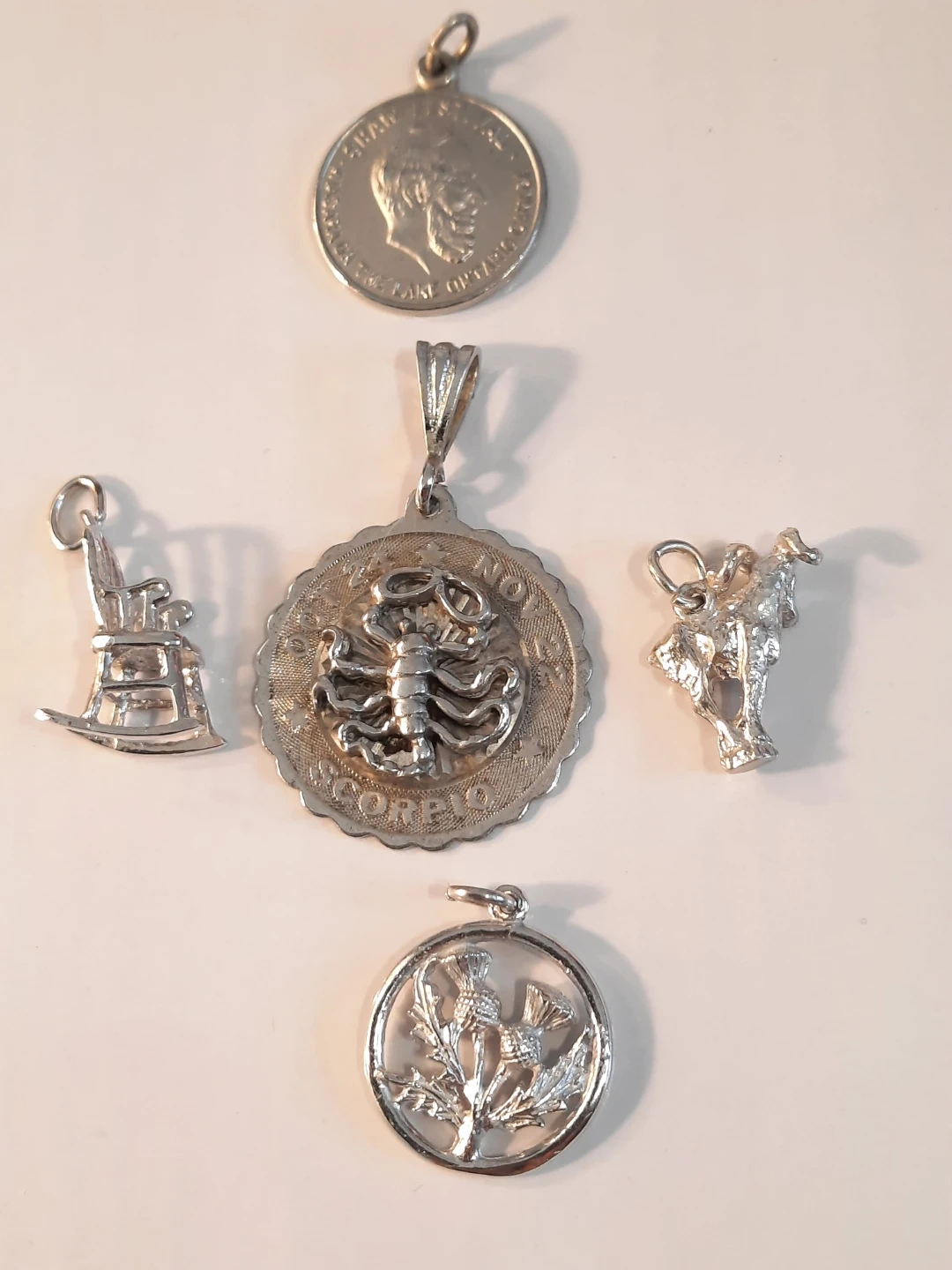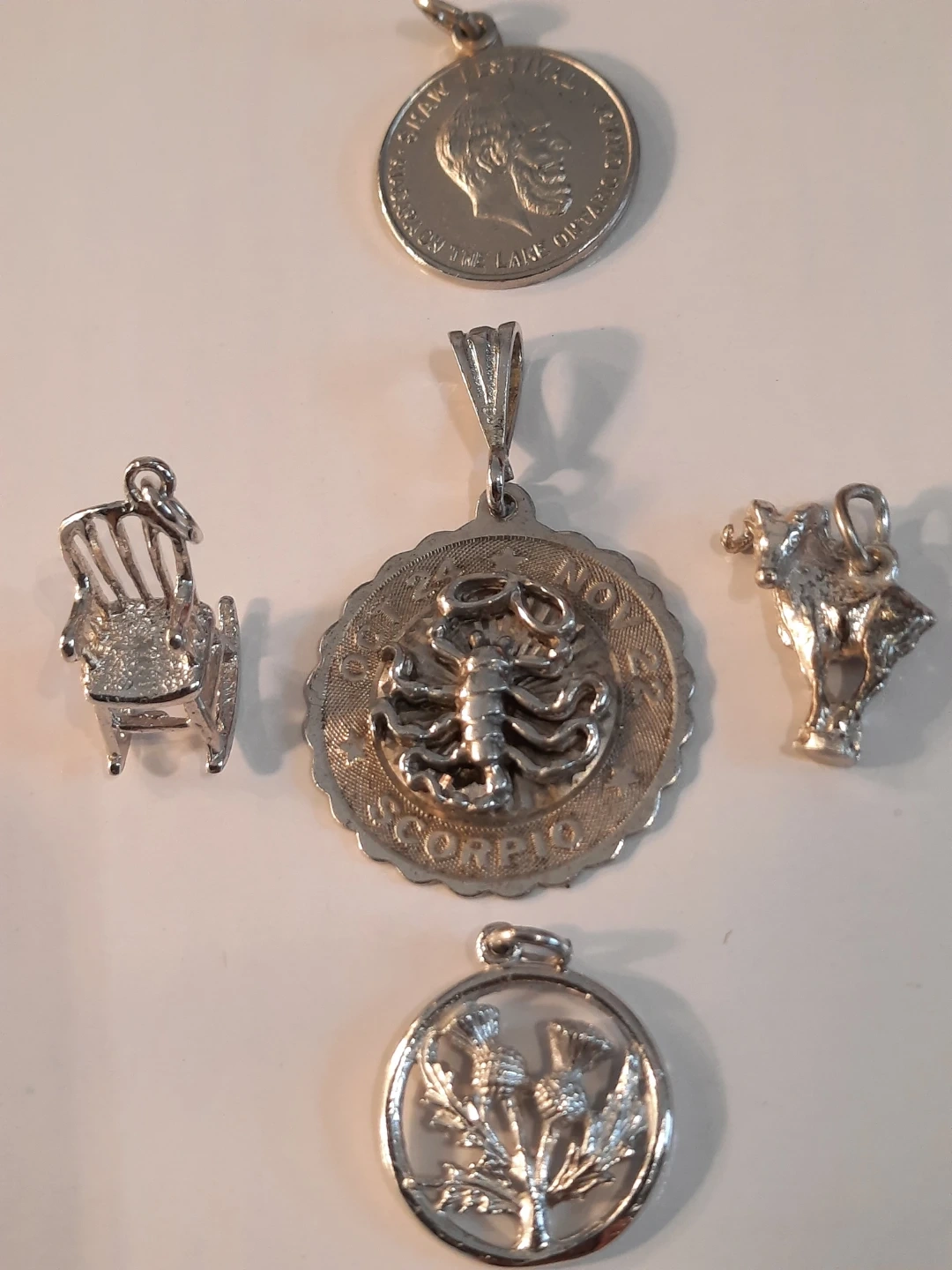 Selling a lot of sterling silver charms.and one big Scorpio pendant.Includes a bull, a rocking chair, a Scorpio zodiac charm, and a thistle charm. Great for jewelry making or collecting!
