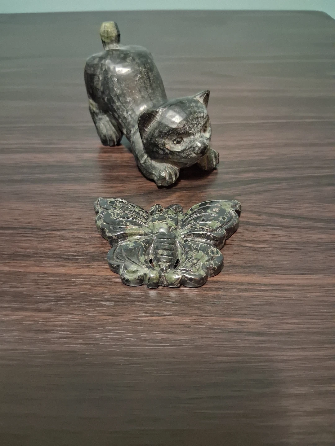 570Selling these serpentine carvings. They're great as decorative pieces or for anyone interested in healing stones. The serpentine stone is also known as Healerite or New Jade. One is a cat the other is a butterfly.
