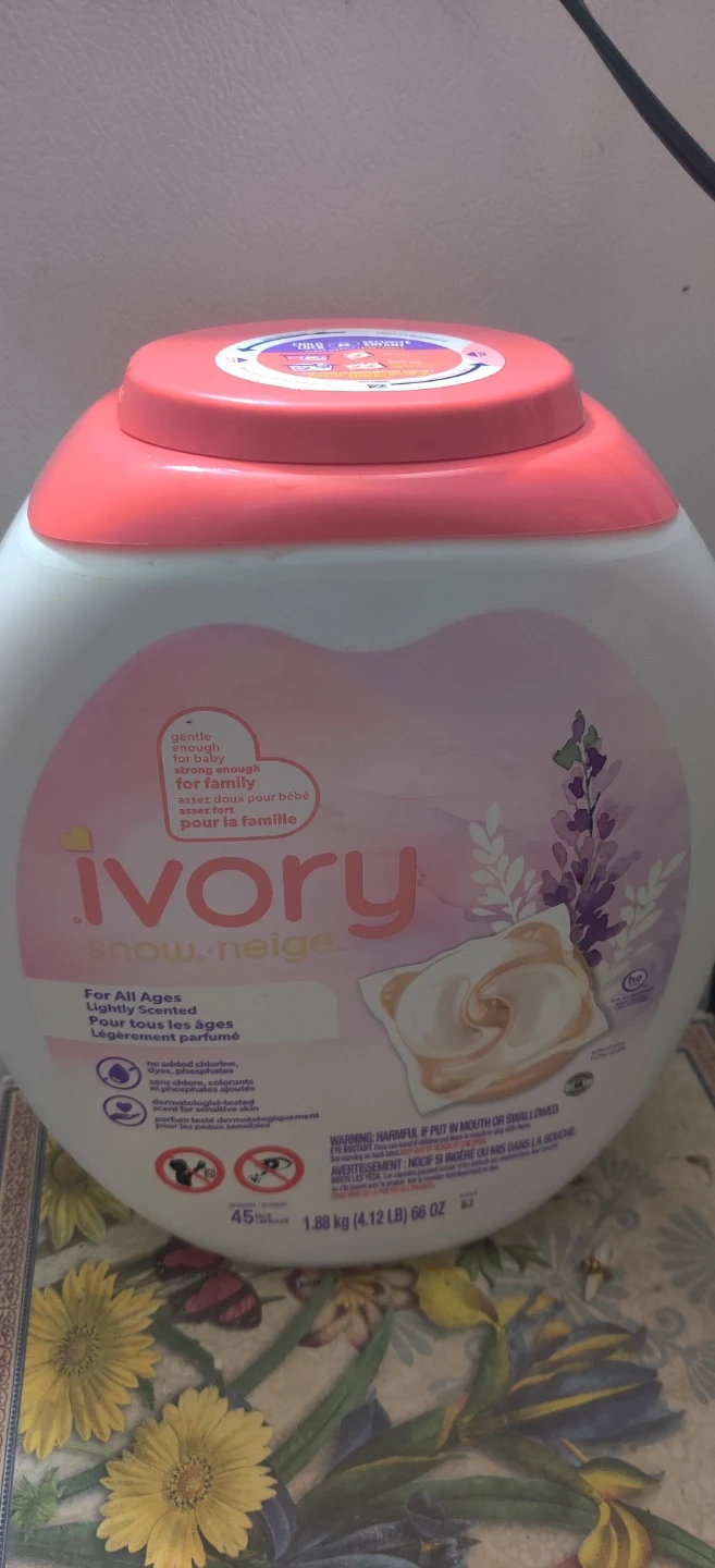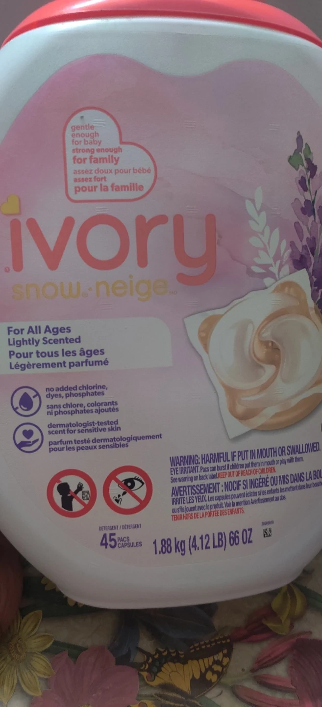 Ivory Snow laundry detergent pacs for all ages! Gentle enough for baby, strong enough for family. Lightly scented and dermatologist-tested for sensitive skin. Contains 45 capsules, 1.88 kg (4.12 lb) 66 OZ