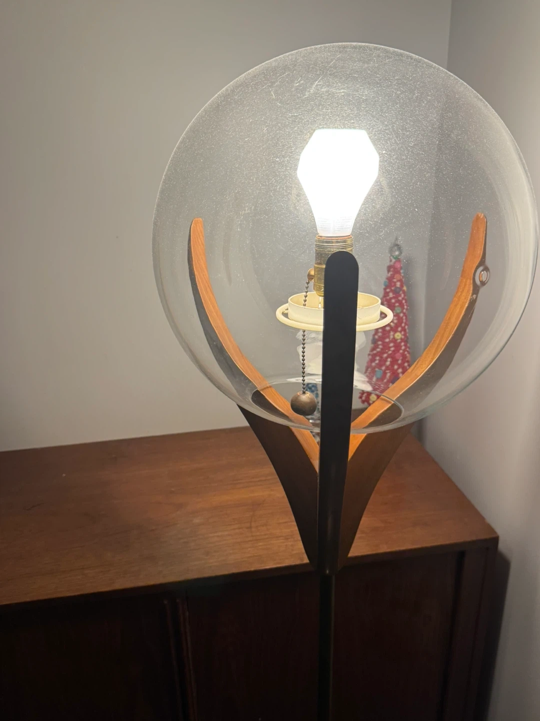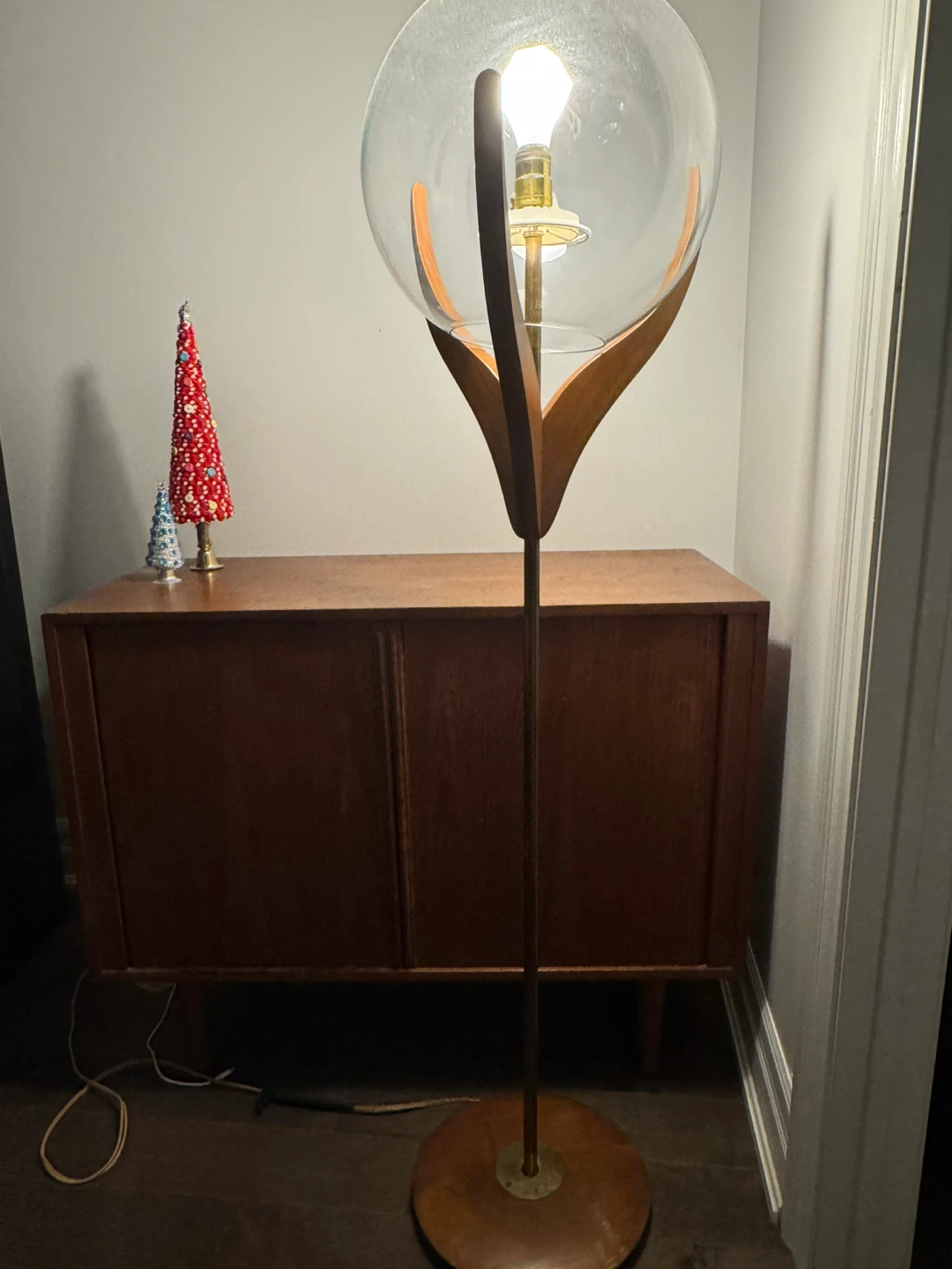 Selling a vintage globe floor lamp. It features a clear glass globe shade and a wooden base with brass accents. The lamp has a Leviton socket. It's a stylish addition to any room!