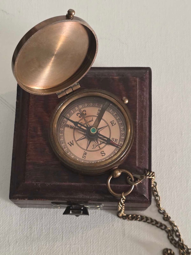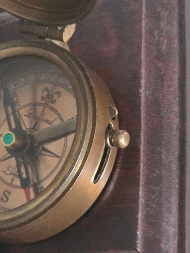 This is a Lefond London antique lockable compass, complete with a wooden case and chain, perfect for collectors or enthusiasts of nautical history. While this compass shows patina consistent with age, it remains a unique and functional piece with a beautiful patina. Here are some details: * Brand: Lefond London * Type: Antique Compass * Material: Brass, Wood * Features: Lockable, Chain Included * Condition: Very good condiywith patina consistent with age. Imagine this compass guiding you on your next adventure, or simply looking elegant on your shelf! If the ad is up, yes, it’s still available – no need to wonder if it has sailed off to a new owner already! The estimated value is $80 based on other listings.