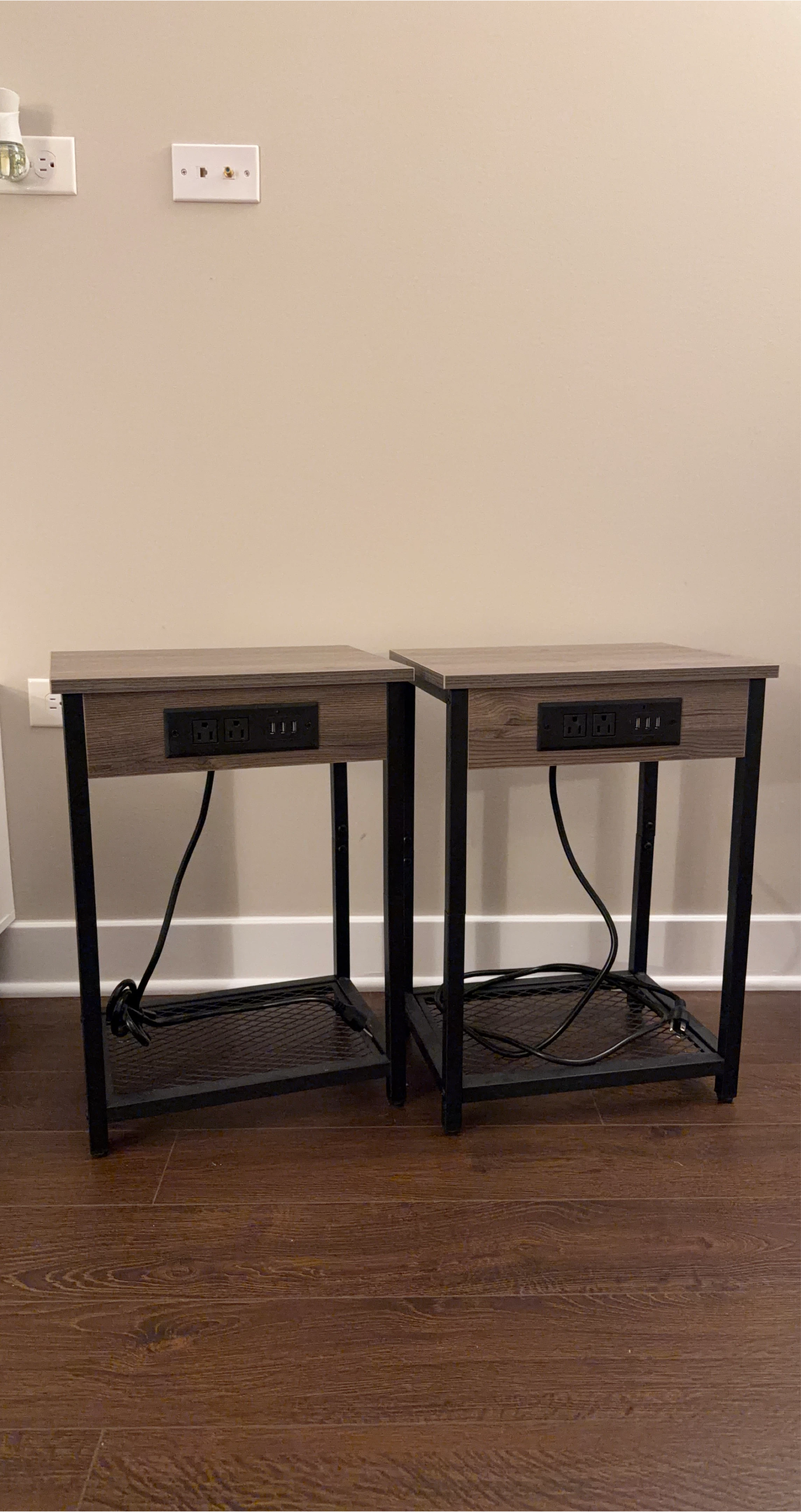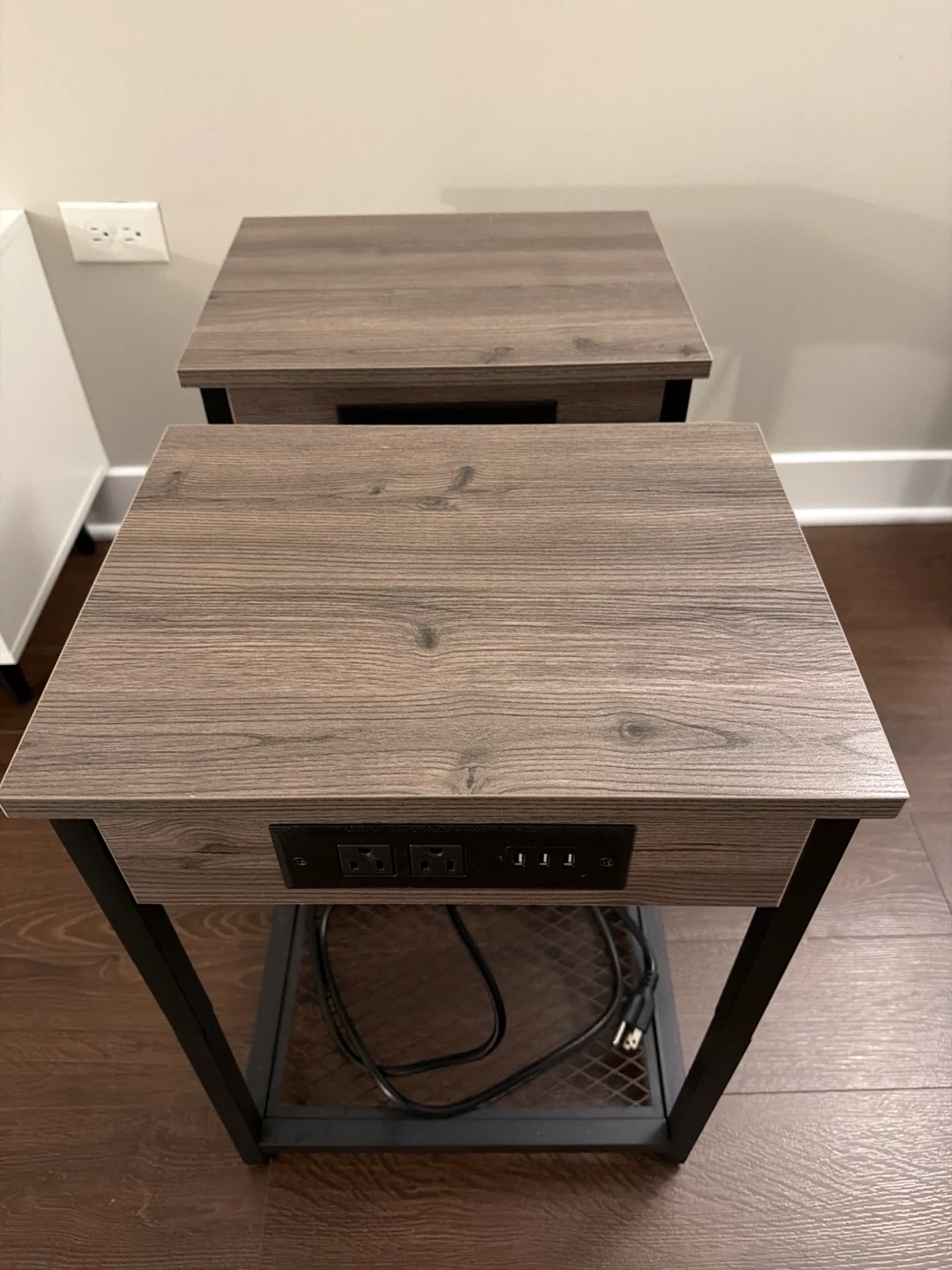 Selling a set of two end tables! They feature a built-in charging station that is completely working, perfect for keeping your devices powered up. The tables have a wood-look top and a black metal frame with a shelf at the bottom. Great for any living room or bedroom!