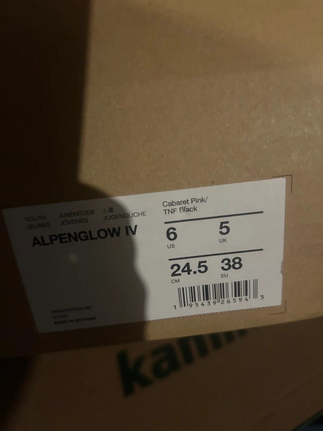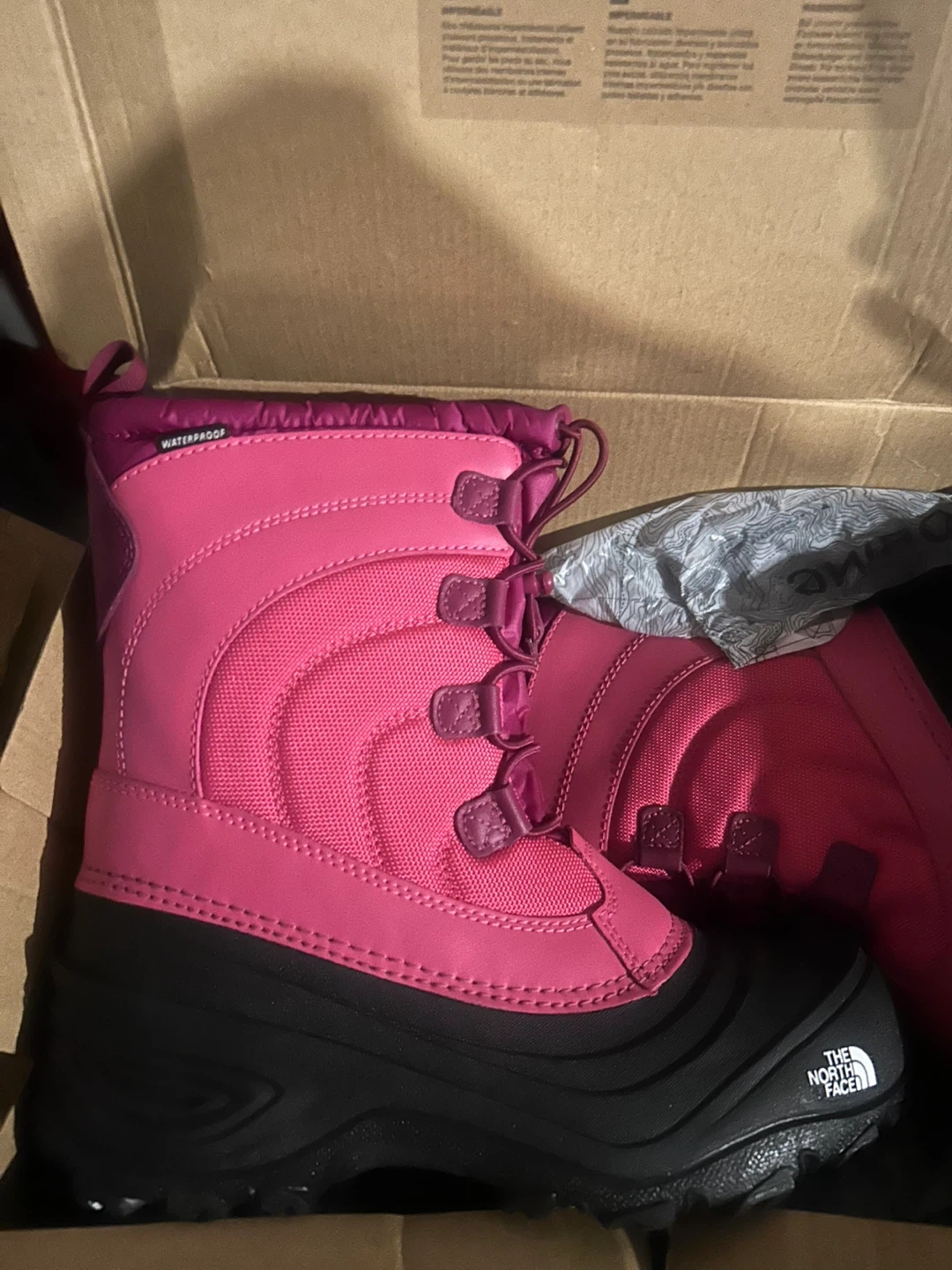 These are a pair of The North Face Alpenglow IV youth snow boots in cabaret pink and TNF black. They are a US size 6, UK size 5, and EU size 38. They are waterproof and come in the original box