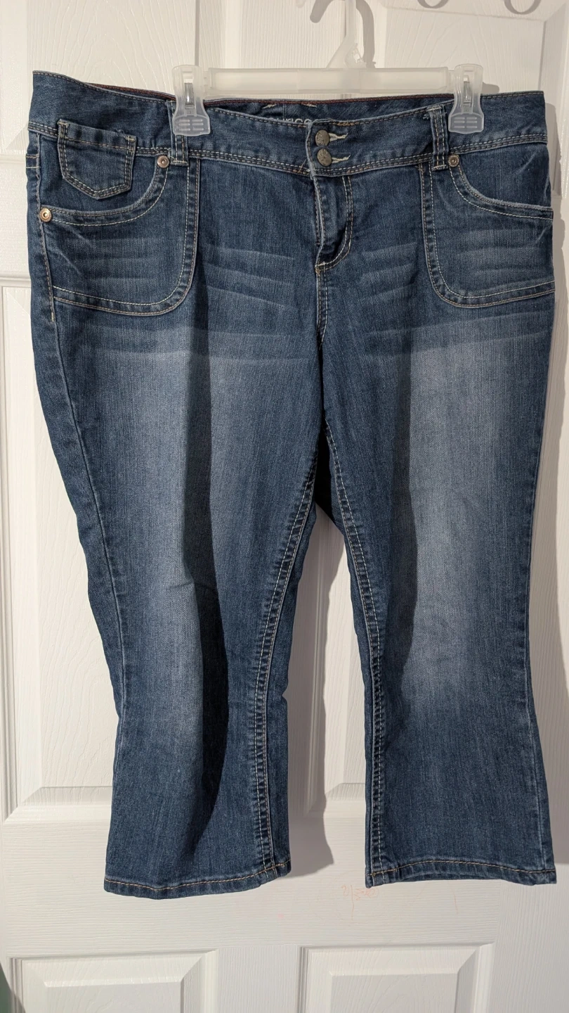 These are a pair of Maurices denim capri pants. They feature a classic denim wash and a comfortable fit, perfect for casual wear.