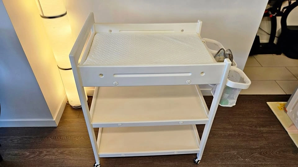 This baby changing table is in truly excellent condition, practically like new. It even comes with a waterproof pad, making cleanups a breeze. Plus, it's on wheels with locks, so you can easily move it around and keep it secure. There's plenty of storage space with shelves and bins to keep all your essentials organized. It’s a fantastic find for any nursery.