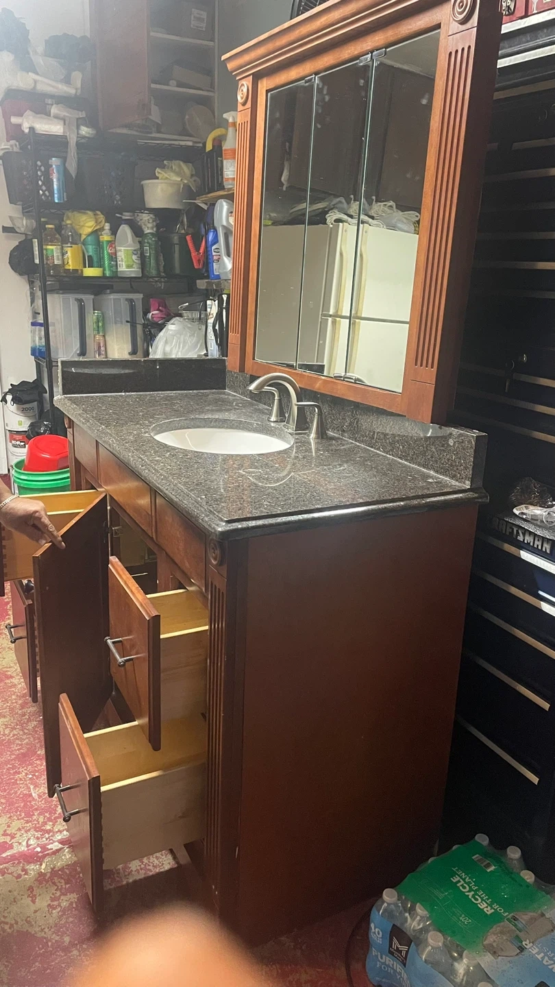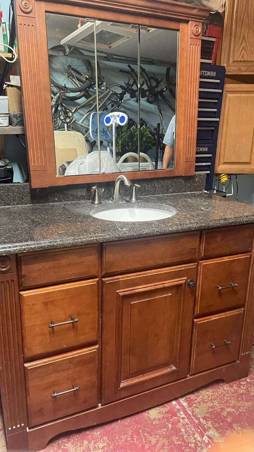 Selling a Grand Bay bathroom vanity with a mirror. It's in good condition and ready to be installed in your bathroom! The vanity features a brown finish and a dark countertop. Perfect for a bathroom upgrade!