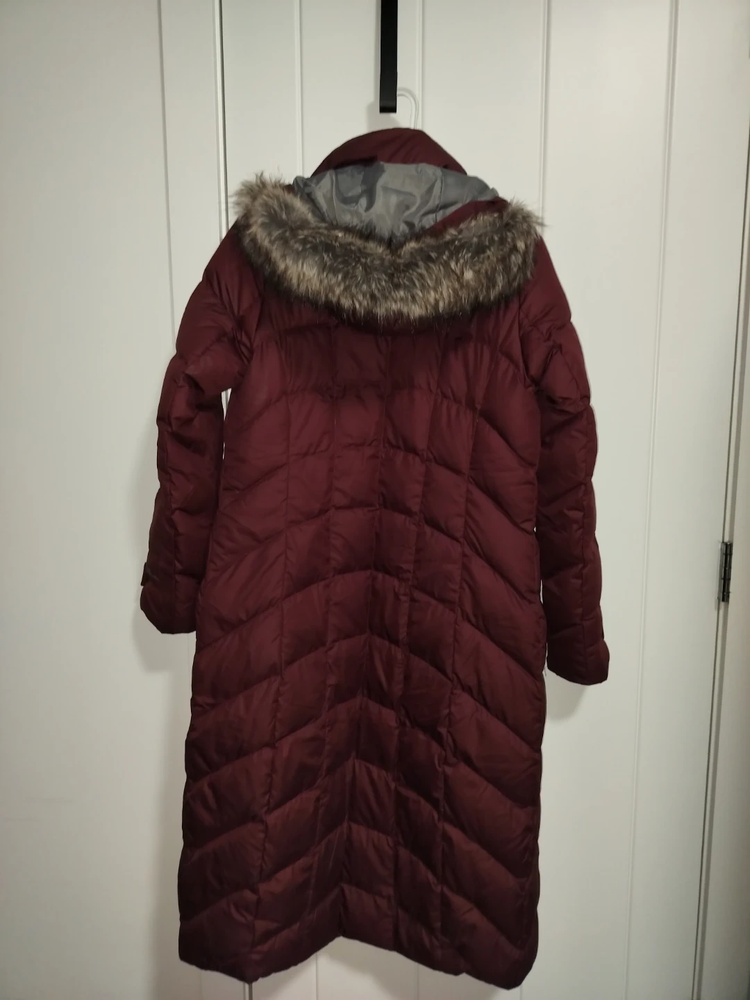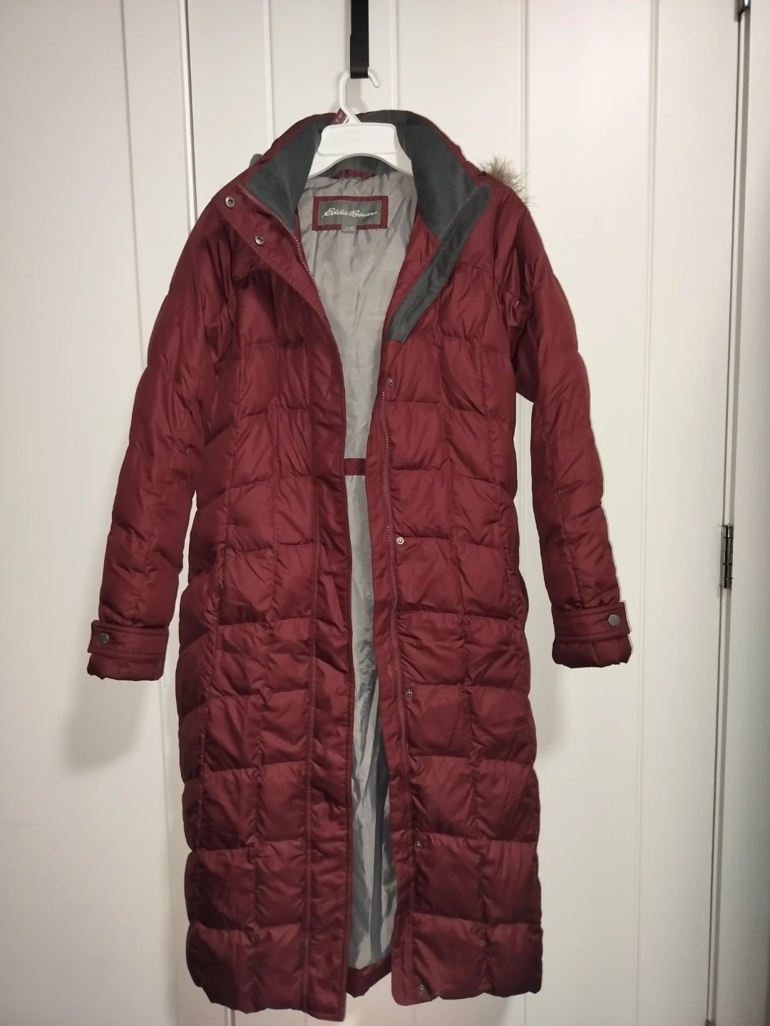 Cozy Eddie Bauer down parka in a lovely burgundy colour! Perfect for staying warm during those chilly Canadian winters. It's in great condition and ready for a new home