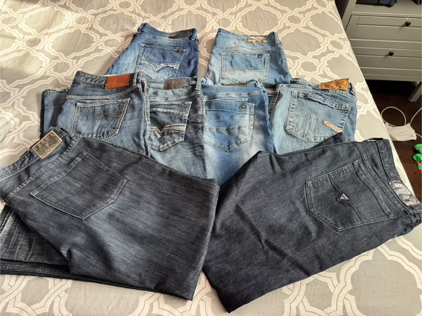 A collection of 8 pairs of gently used men's jeans in various shades of blue and denim washes. Brands include Guess, Buffalo, Parasuco and Mexx. Size 36. Perfect for someone looking to expand their wardrobe with some stylish and comfortable denim!