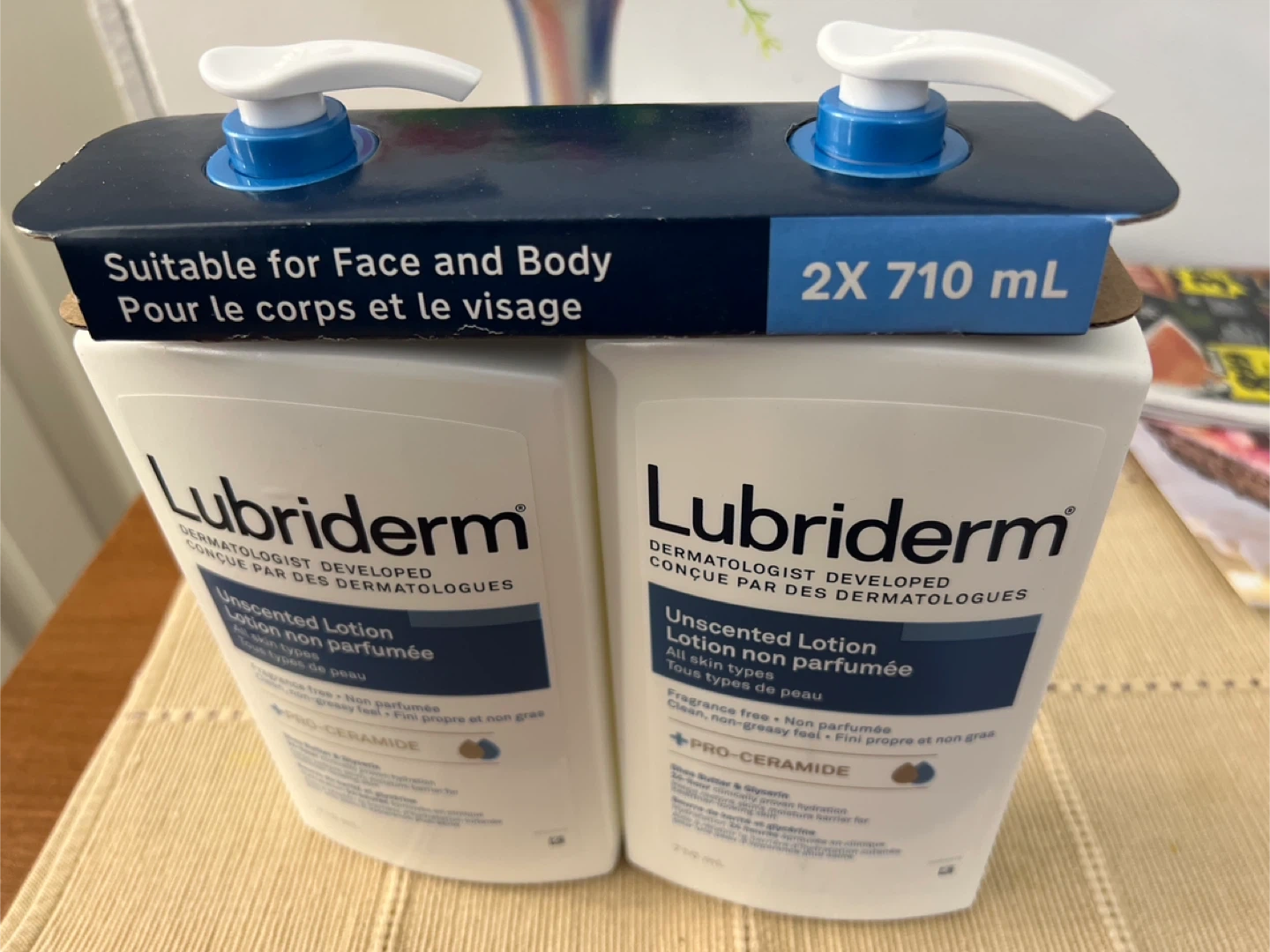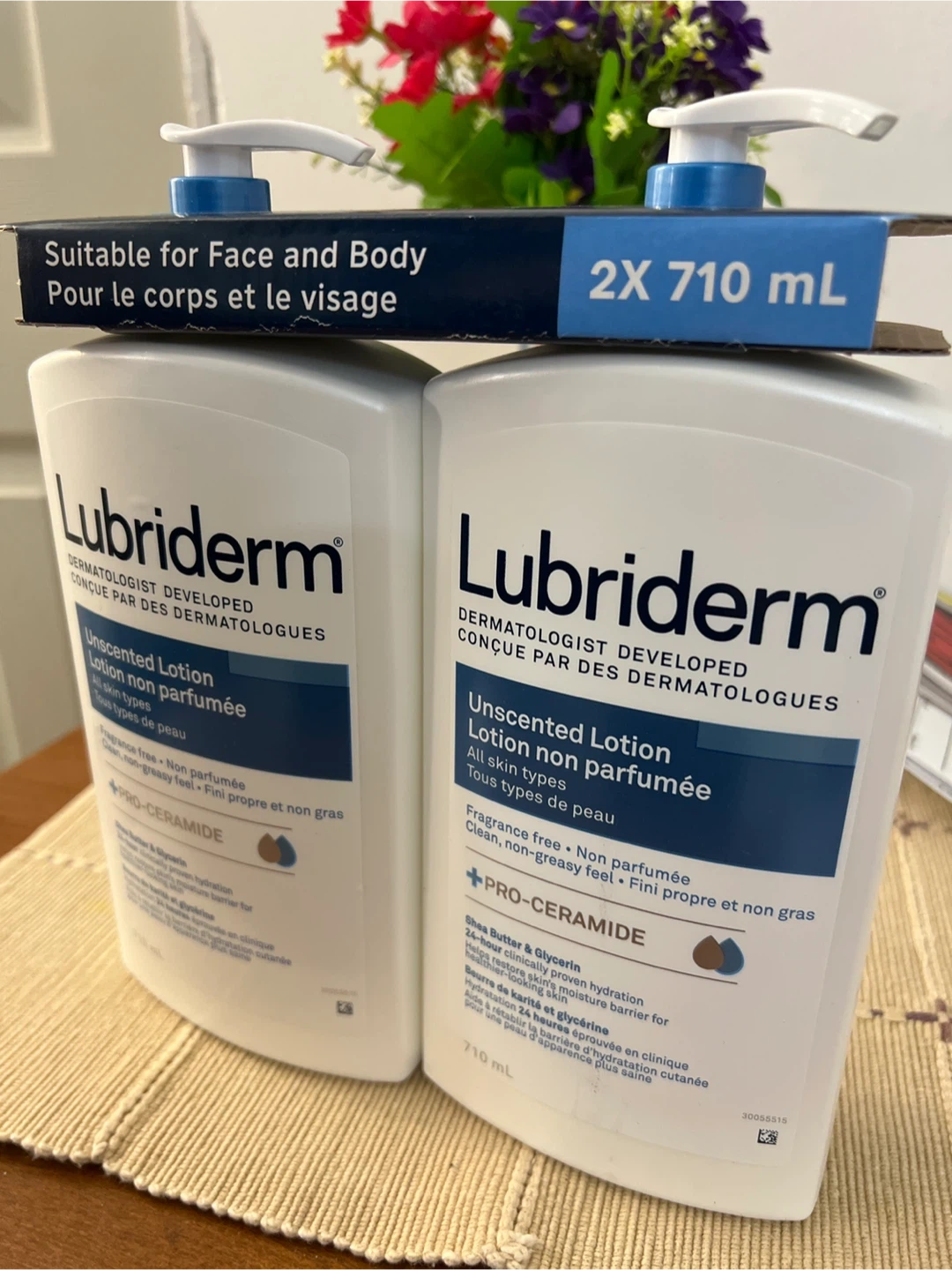 Selling a pack of two Lubriderm unscented lotions, each bottle containing 710mL. This lotion is dermatologist developed and suitable for all skin types. It's fragrance-free and non-greasy, perfect for face and body use. Enjoy 24 hours of continuous hydration!