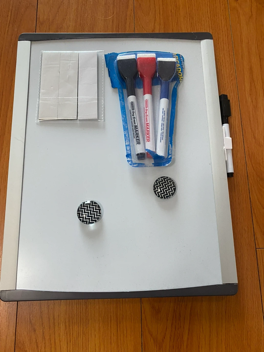 Selling a whiteboard that comes with dry-erase markers and magnets! Perfect for jotting down notes or brainstorming ideas.