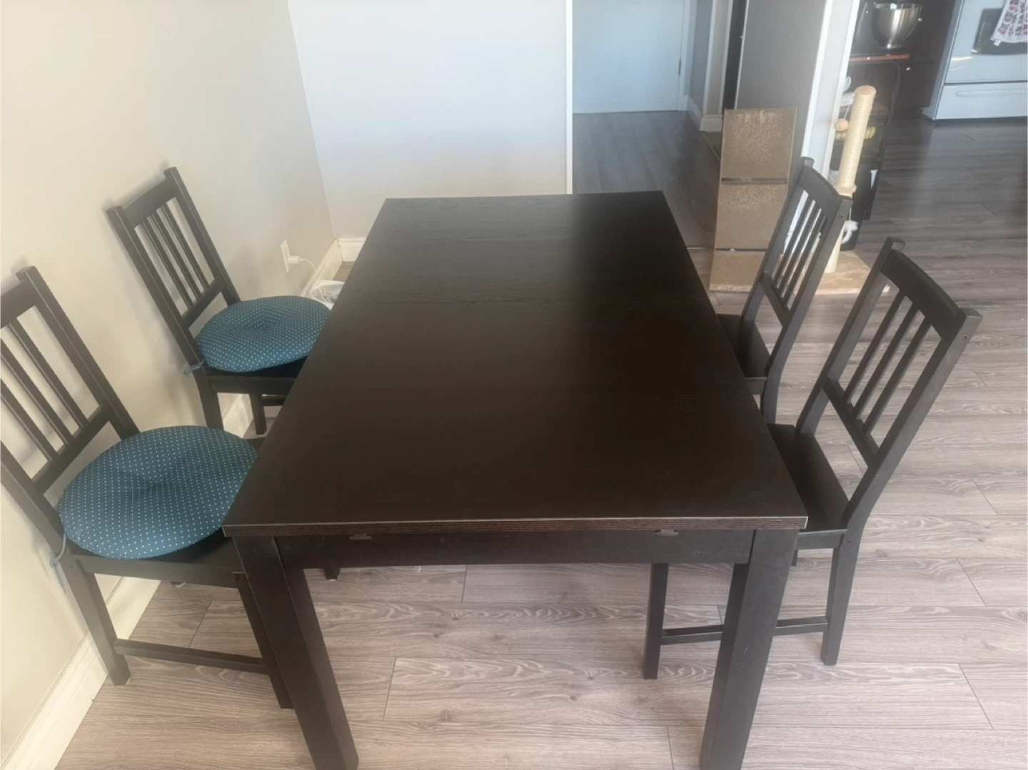 26Selling a dining table set that includes an extendable table and four chairs. It's perfect for family dinners or having friends over. The set is in great condition and ready for a new home! This is ikea and it comes with an extension to make it a six seater.
