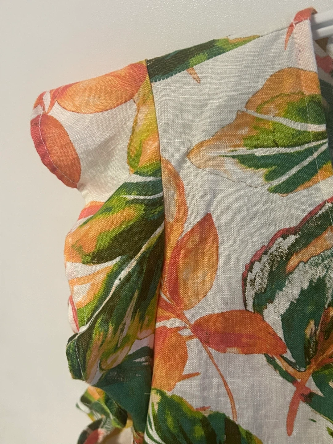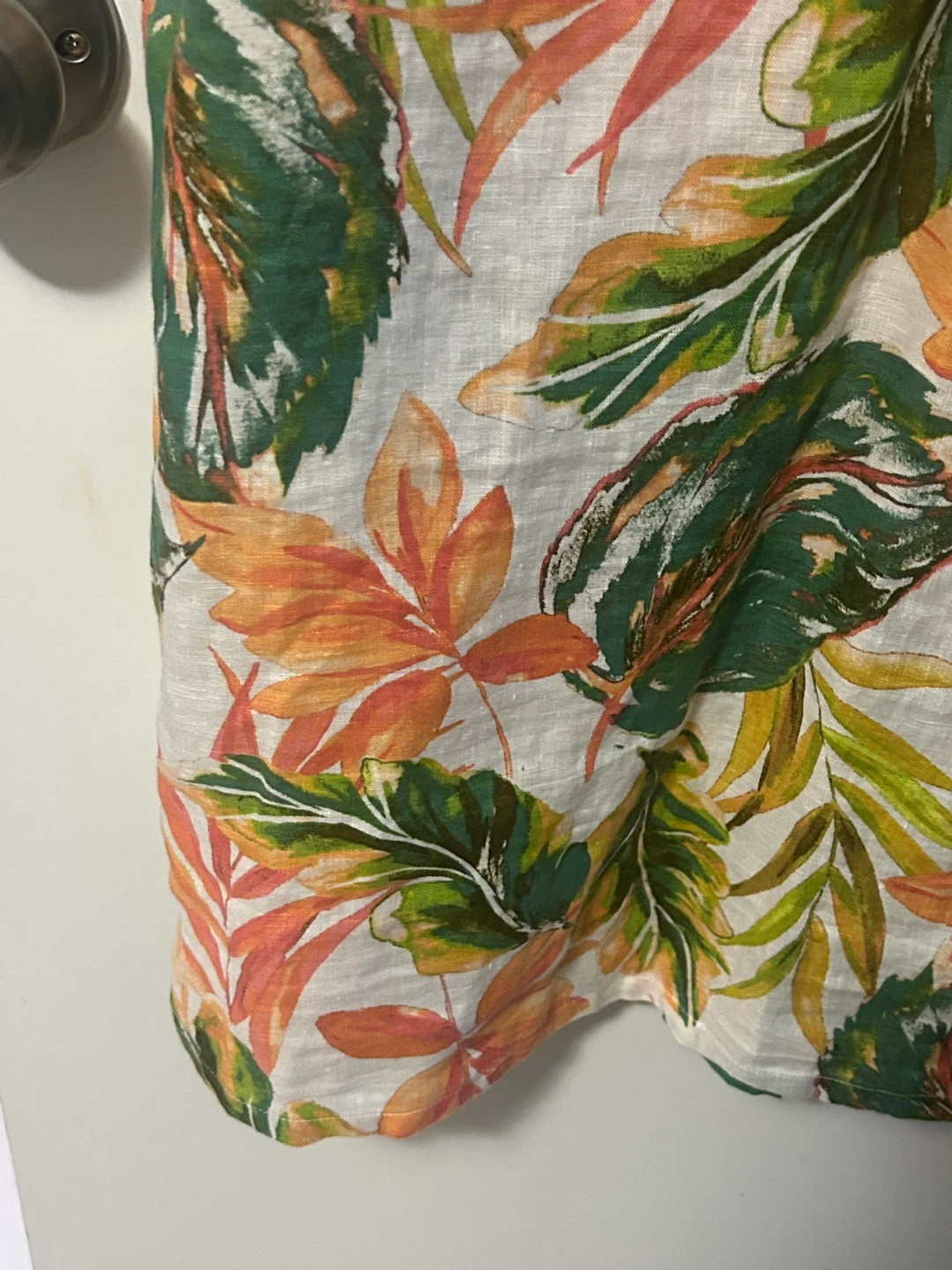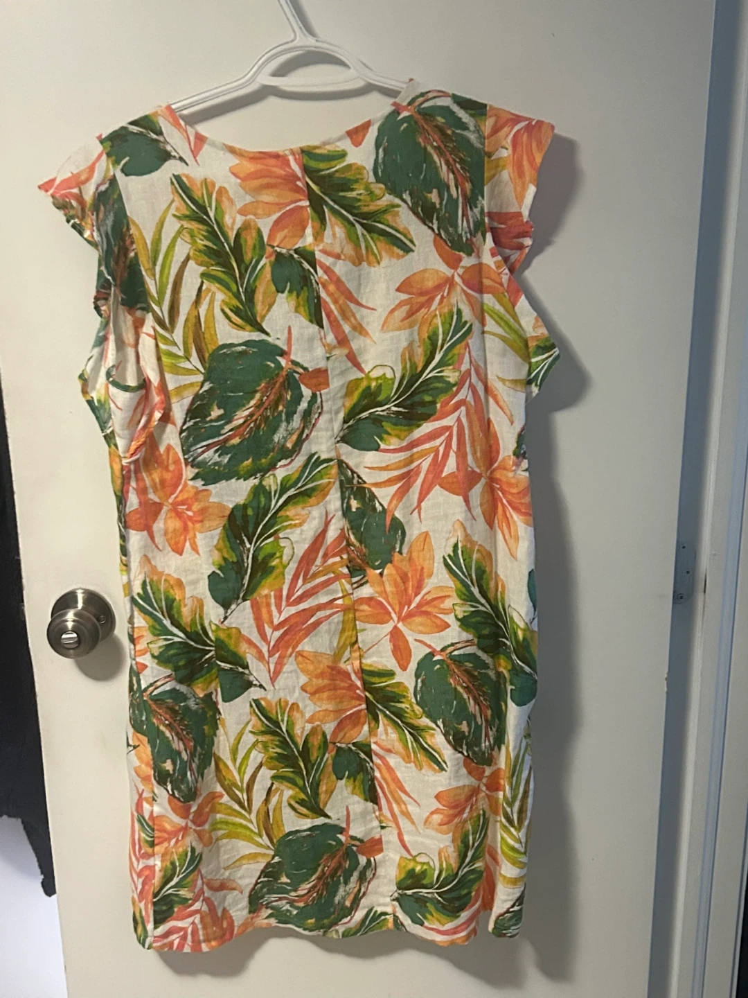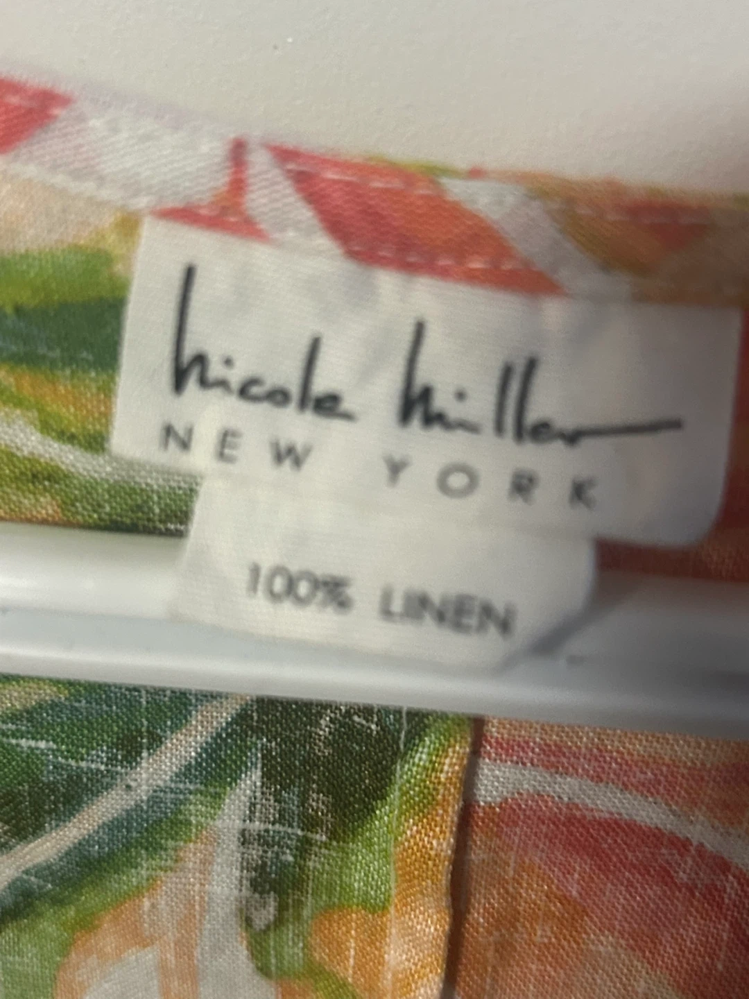 This Nicole Miller New York LINEN Summer dress is in great condition. It features a vibrant leaf pattern in shades of green, orange, and yellow. The dress is a size M and originally retailed for $39.99.