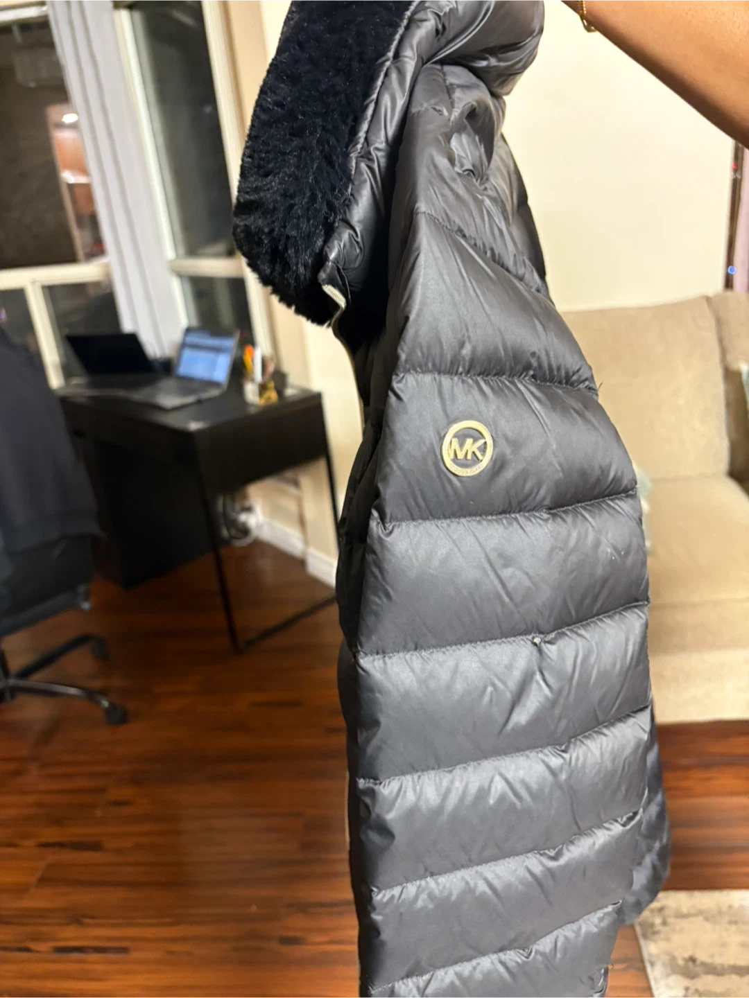 Selling a stylish black puffer coat from Michael Kors! It features a faux fur collar and a sleek design. Perfect for staying warm and fashionable during the colder months!