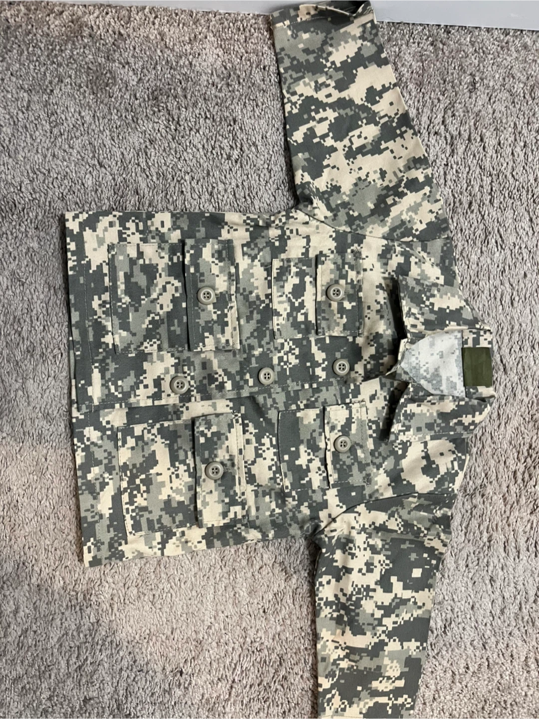 Selling a camouflage jacket. It features a digital camouflage pattern in shades of gray and beige. Has multiple pockets with button closures. Good condition!