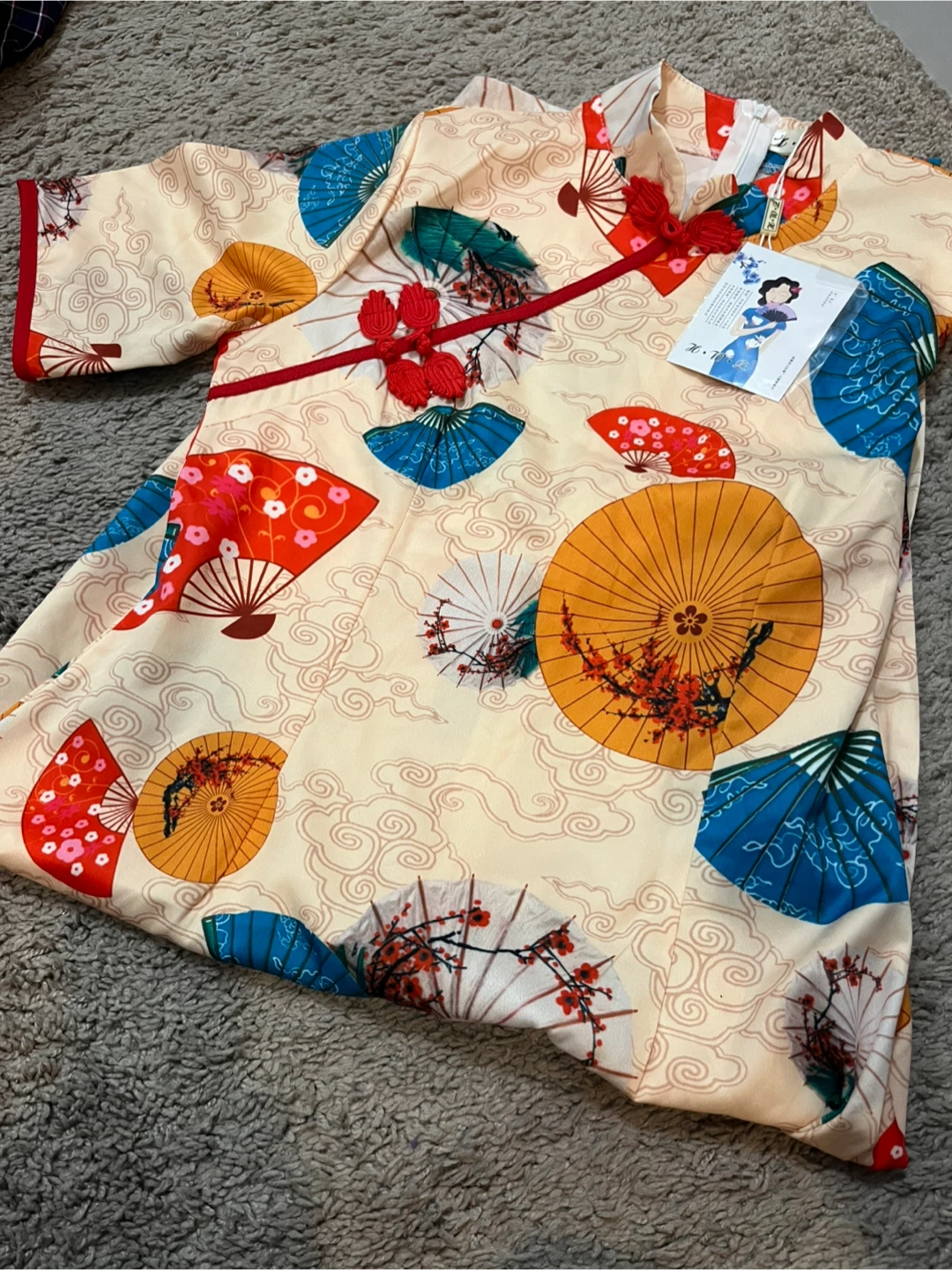This is a dress with a unique pattern! It features a cream-coloured background with a fan and cloud design in various colours like red, orange, and blue. The dress has red trim and decorative knots at the neckline. It's in great condition and ready for a new home