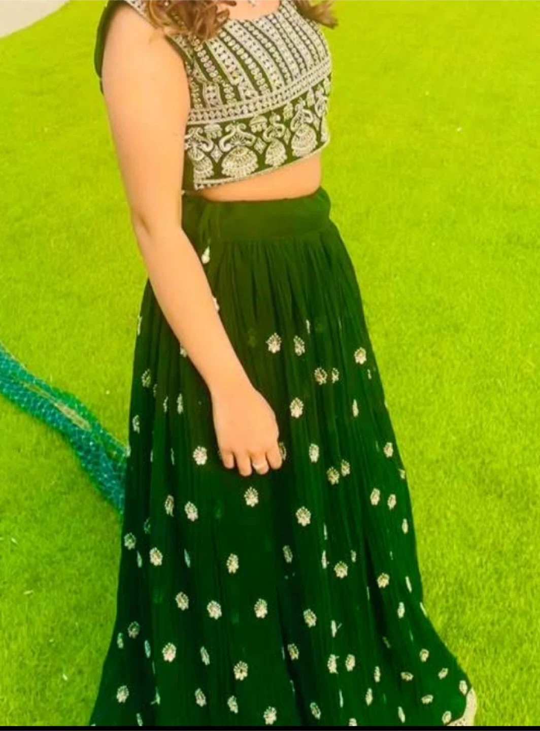 Selling a beautiful green lehenga choli set. It features a sleeveless crop top with intricate silver embroidery and a matching long, flowing skirt with delicate white floral patterns. It also includes a light dupatta.