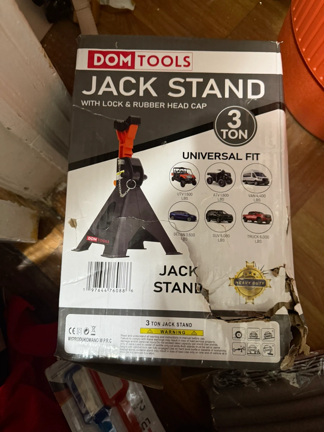 Selling a DOM TOOLS jack stand with a 3-ton capacity. It features a lock and rubber head cap for added safety and stability. This jack stand is designed for universal fit, accommodating various vehicle types such as UTVs, ATVs, sedans, SUVs, vans, and trucks. It's a heavy-duty stand to help you with your projects!