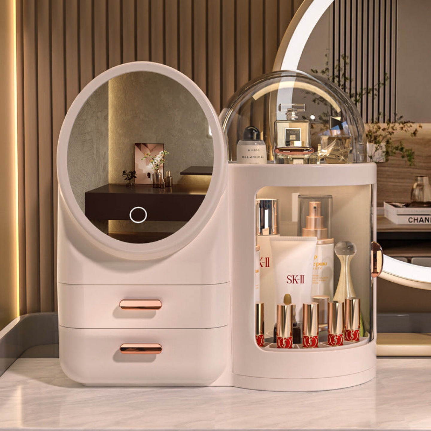 Declutter your vanity with this stylish makeup organizer! It features a built-in mirror, drawers, and storage compartments to keep all your beauty essentials neatly organized and easily accessible