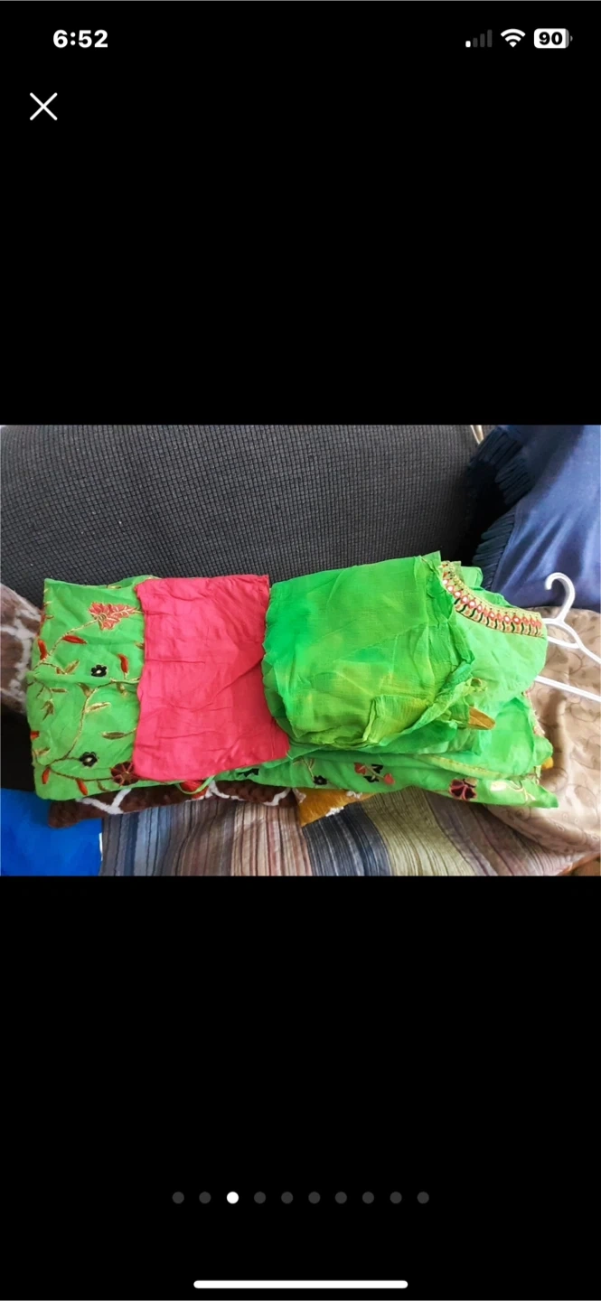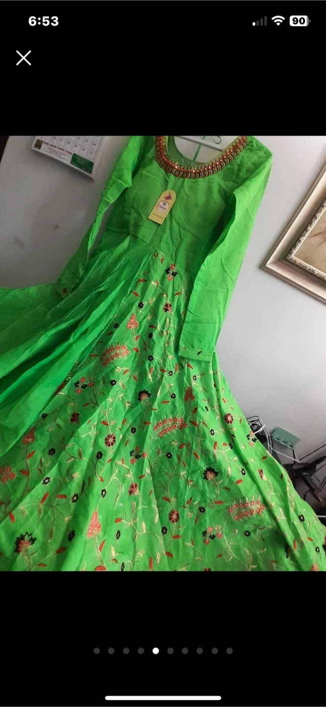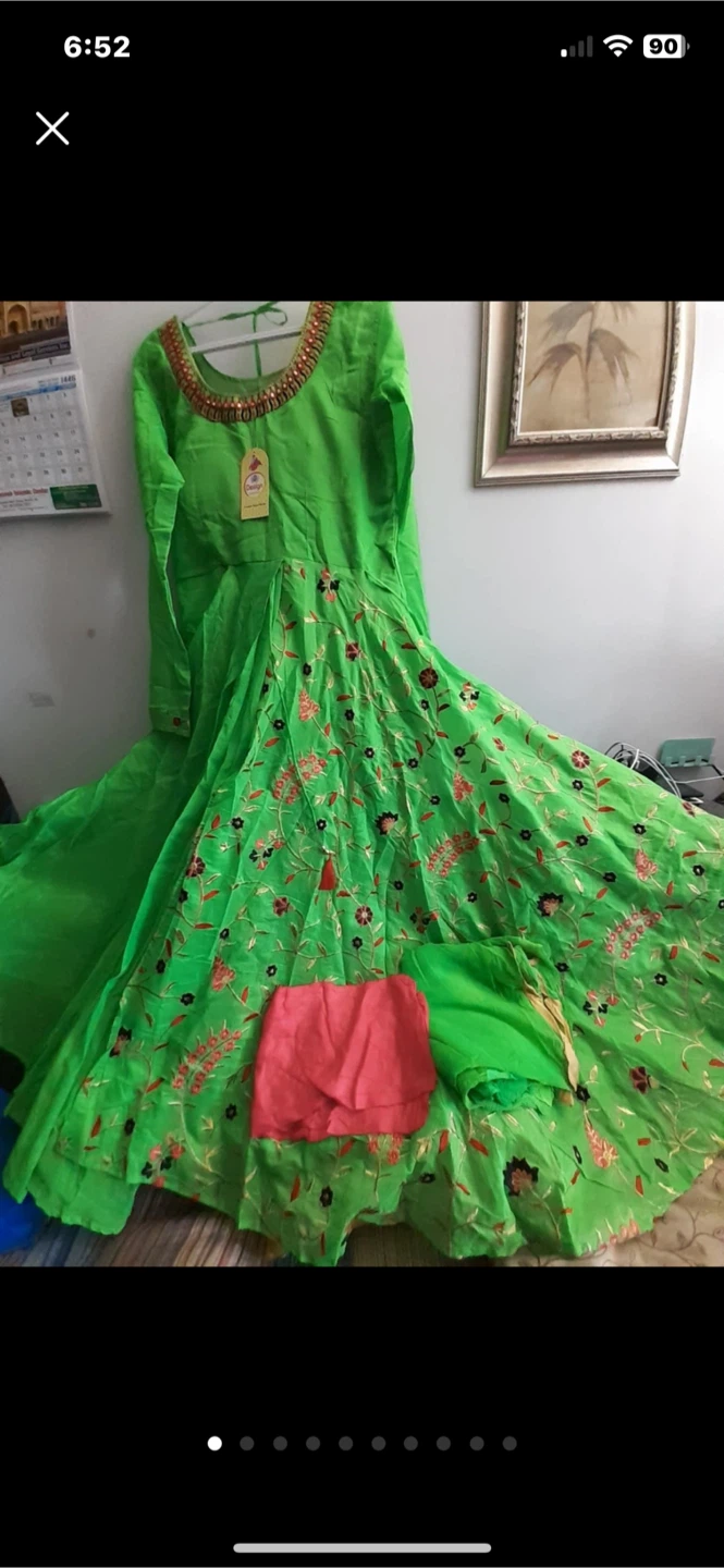 This is a beautiful green Anarkali dress with intricate embroidery. It includes a matching pink dupatta. Perfect for special occasions! Txt for pricing and others