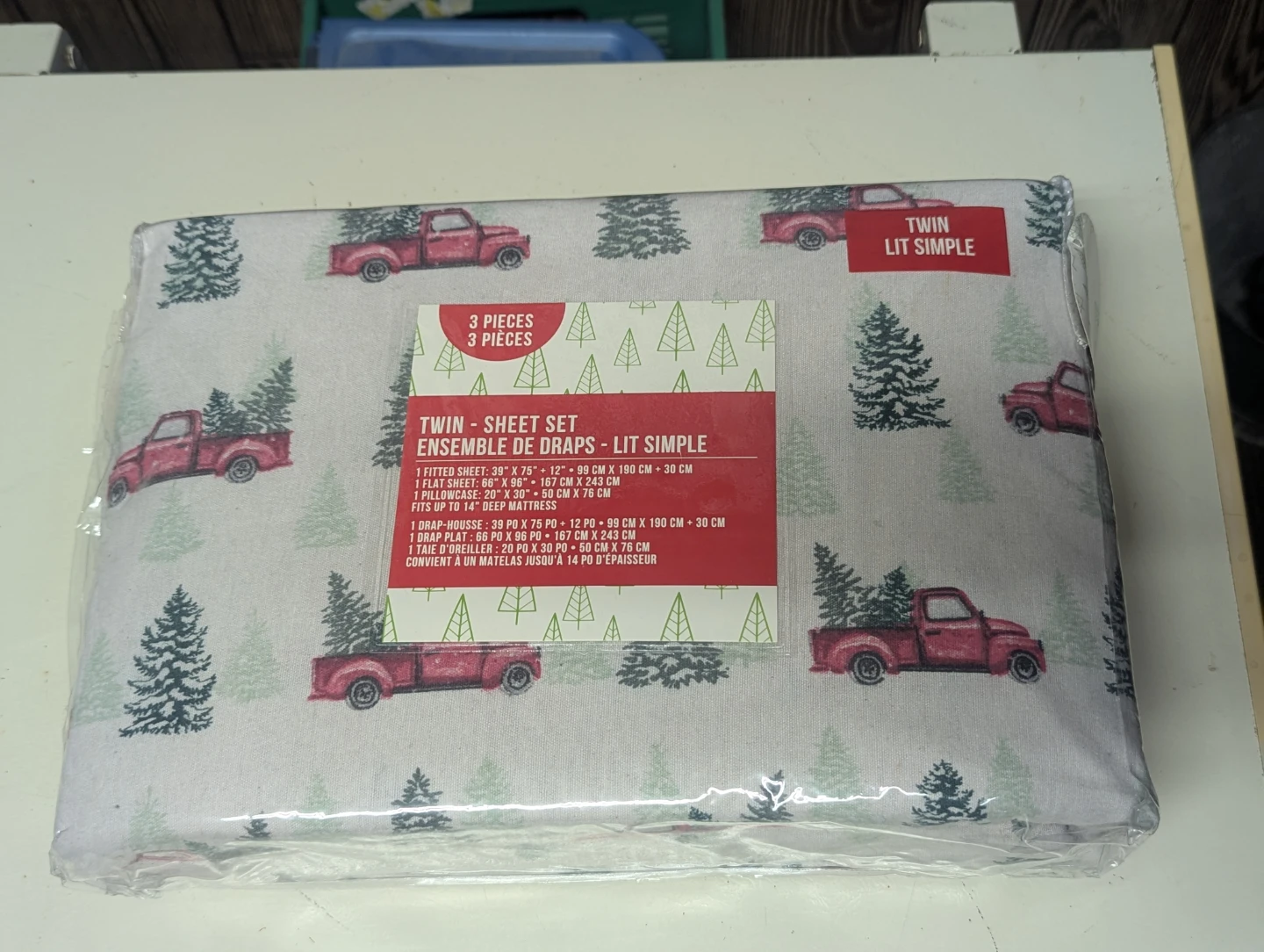 Brand new in packaging twin sheet set! Features a cute truck and Christmas tree pattern. Includes a fitted sheet (39" x 75" + 12"), a flat sheet (66" x 96"), and a pillowcase (20" x 30") It is a 3 piece kit. Retails for 35.00