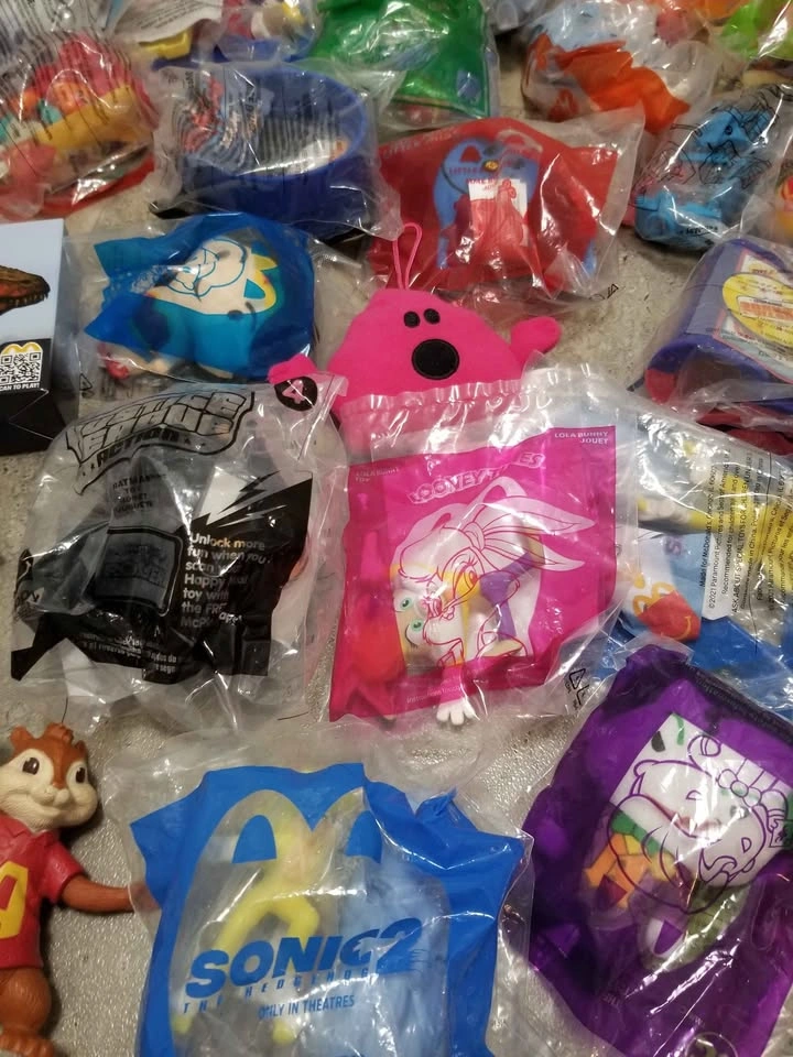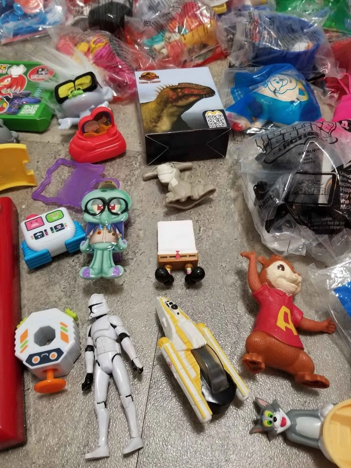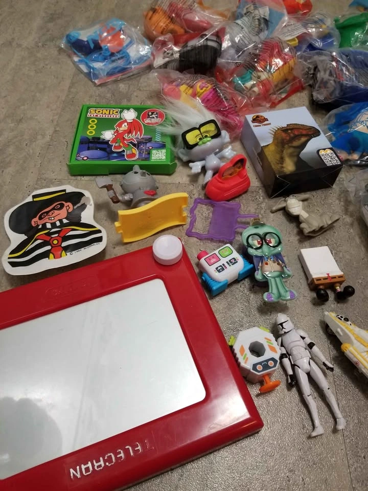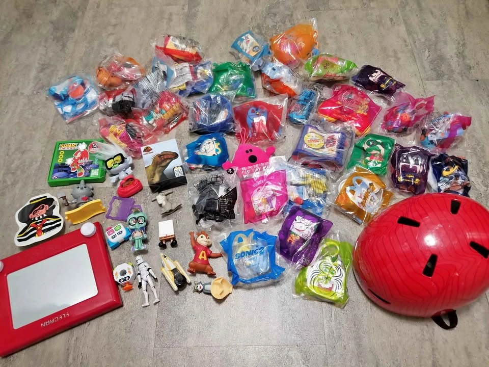 80All for $5. Child size helmet is 50 - 54 cm. Includes an etch a sketch and some toys mostly from mc donalds happy meals. Located near Conroy and Johnston road