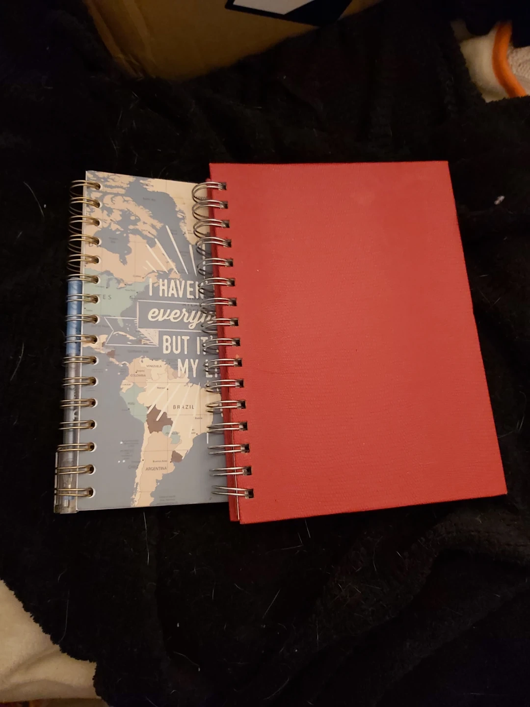 31Two spiral notebooks, one red and one with a world map design