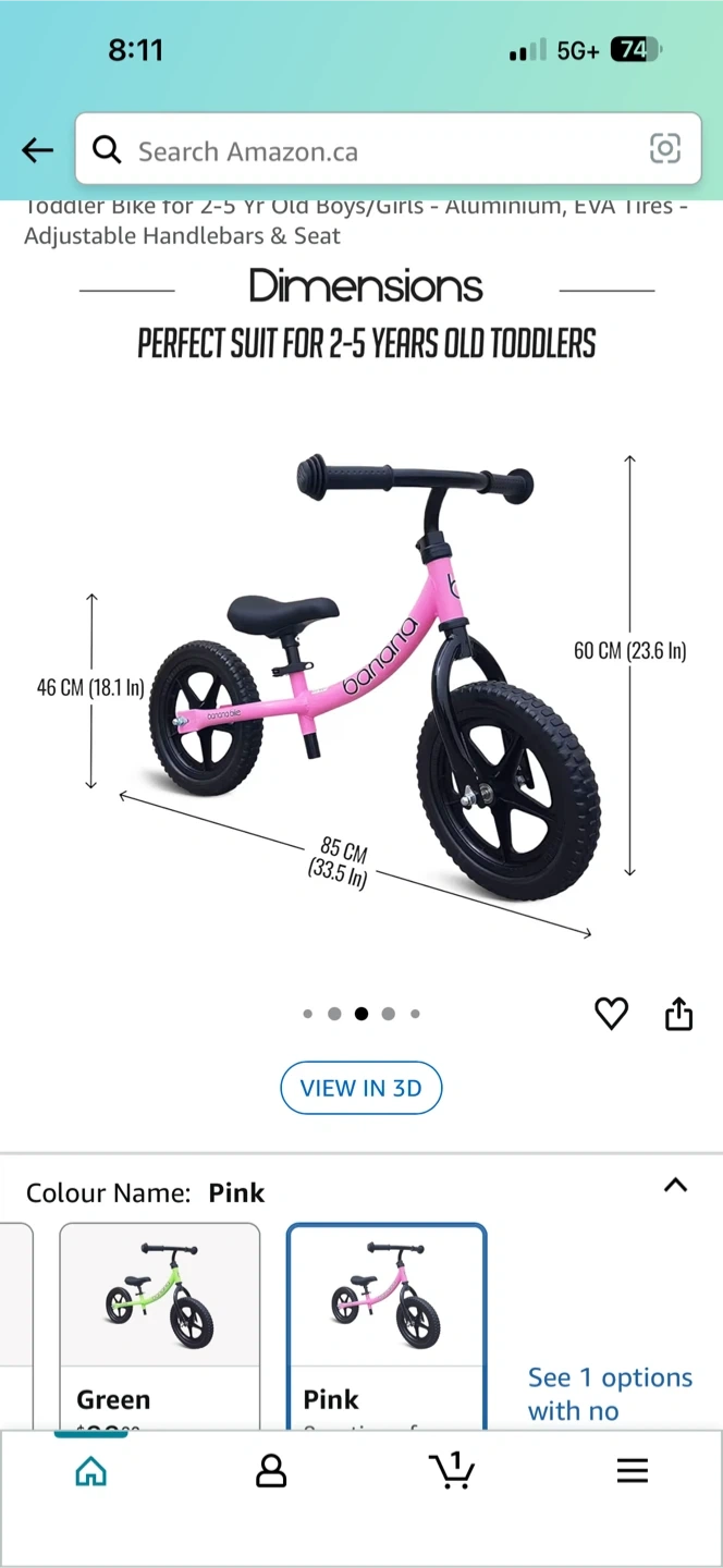 Selling a cute pink Banana balance bike, perfect for toddlers aged 2-5 years! It's in great shape and ready for a new little rider. The bike is designed to help develop balance and coordination, making it a fun way to learn to ride a bike. Dimensions are: 46 cm (18.1 in) height, 60 cm (23.6 in) handlebar height, and 85 cm (33.5 in) length