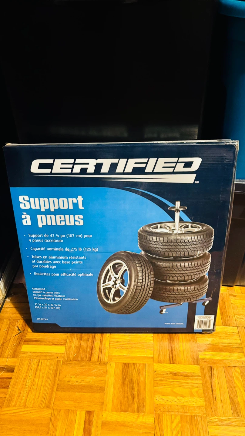 Selling a Certified tire support that can hold up to 4 tires. It's designed to support 42 1/4 inches (107 cm) and has a nominal capacity of 275 lb (125 kg). It includes six (6) casters, fasteners, assembly instructions and guide. The dimensions are 21 1/8 x 20 x 42 1/4 inches (53.6 x 51 x 107 cm)