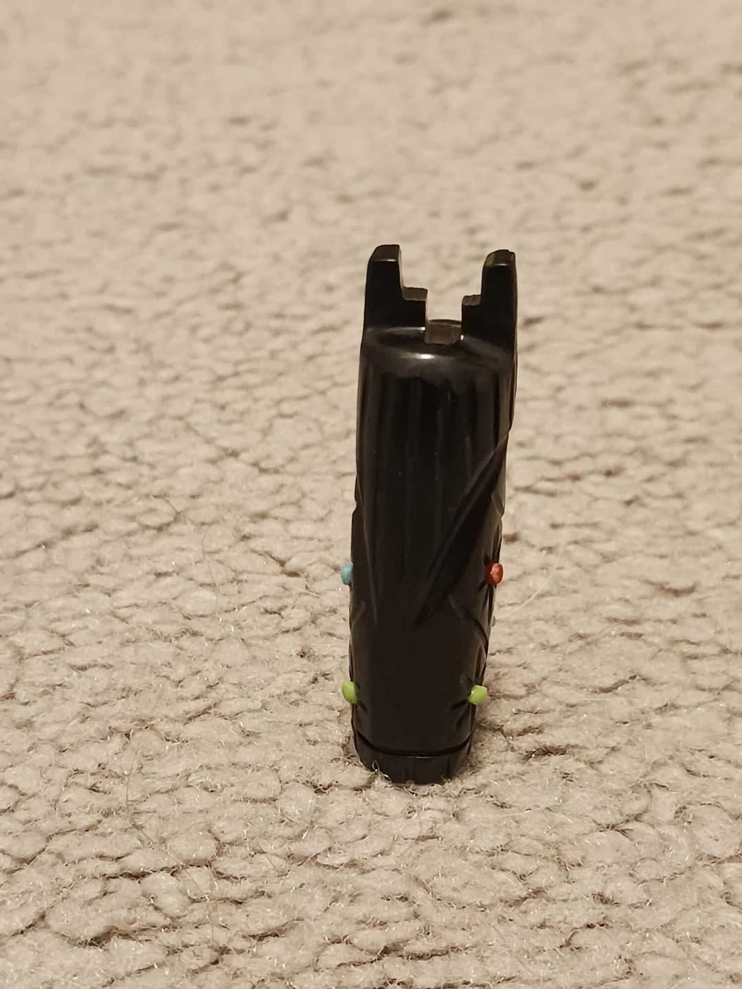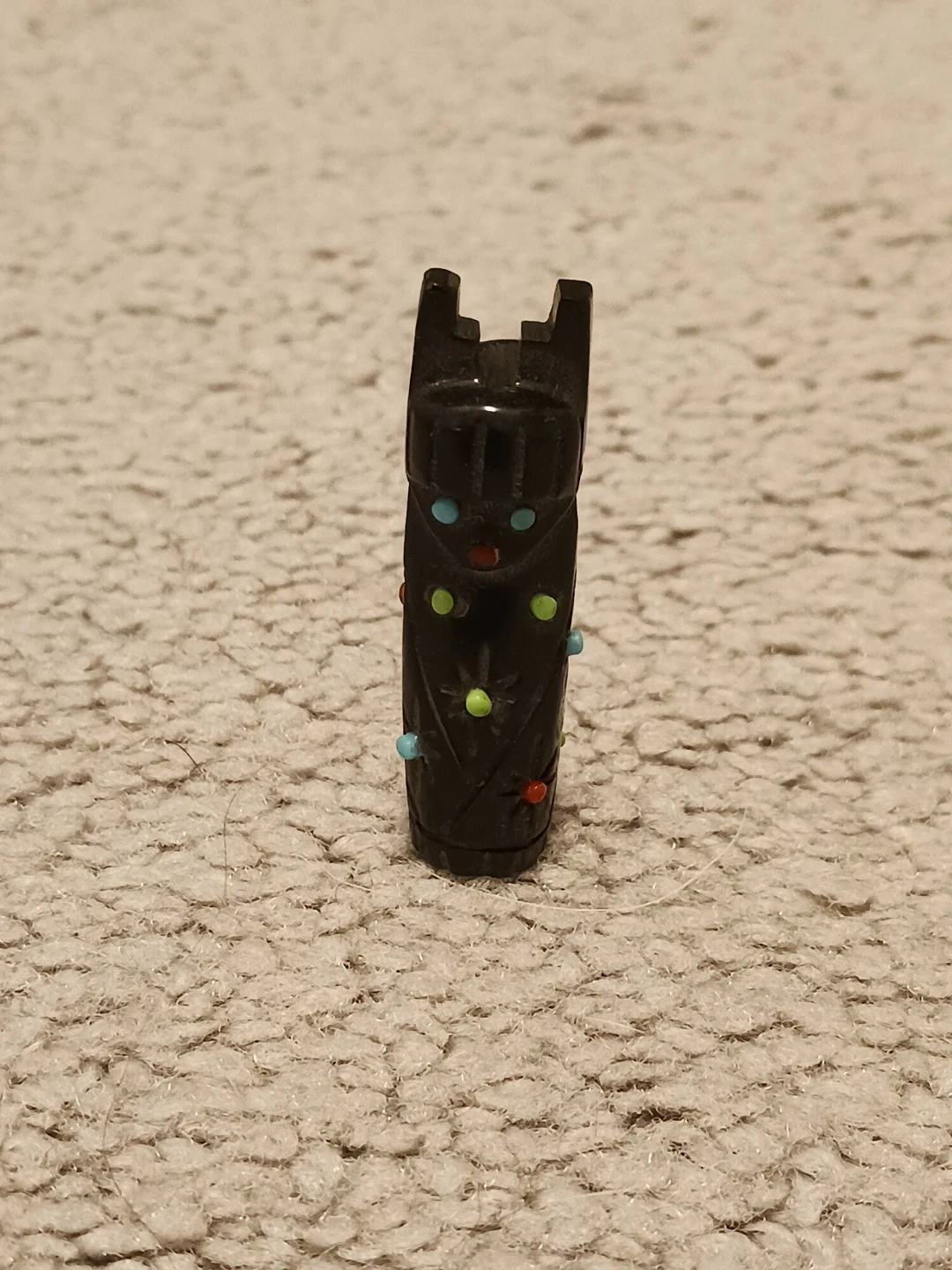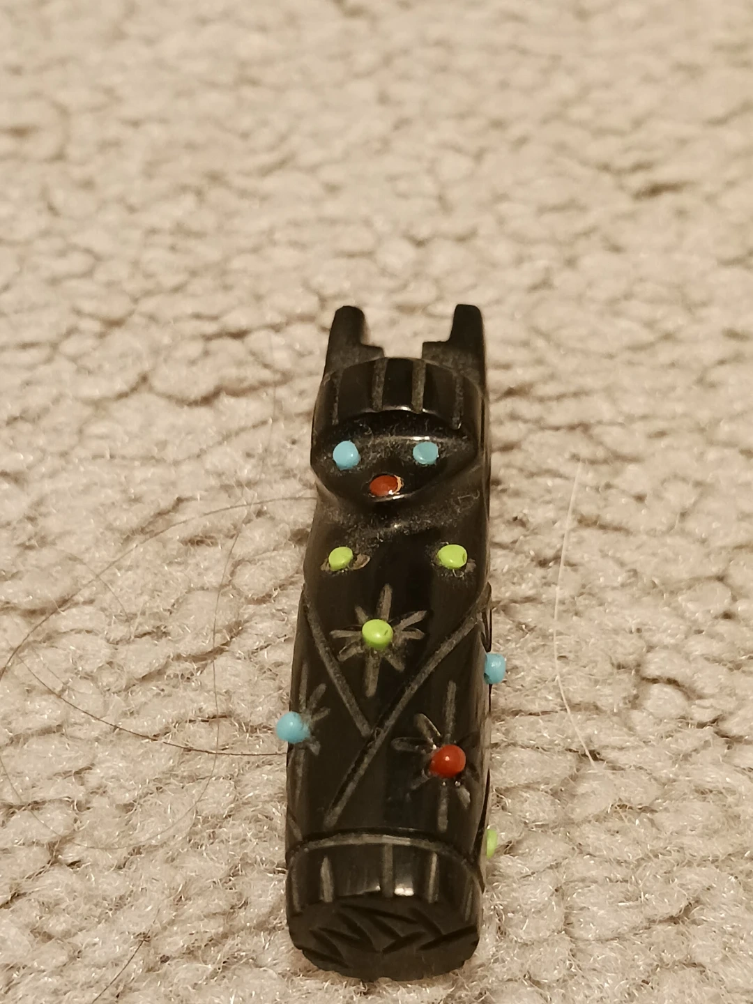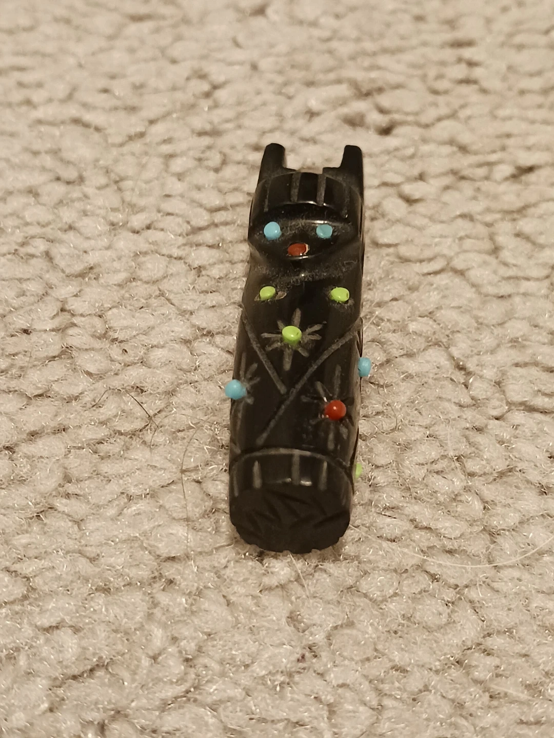 Beautiful little corn maiden fetish. It is carved from jet and has turquoise and other small embellishments. It is a traditional artwork created by Zuni carvers Terrence and Jessica Martza.
