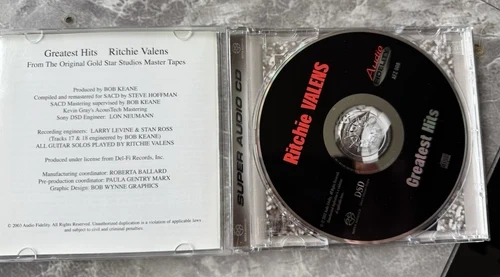 Dive into the rich sounds of Ritchie Valens with the "Greatest Hits" compilation, presented on a high-fidelity Super Audio CD (SACD). This collection, released in 2003 by Audio Fidelity, features the classic tracks that have been enchanting music lovers for decades, all in a format that offers an exceptional auditory experience. The CD boasts the finest audio quality, allowing listeners to appreciate the nuances of Valens' powerful vocals and the instrumentals that accompany them. As a rare find, this SACD edition of Ritchie Valens' greatest hits is a must-have for audiophiles and music enthusiasts alike, providing a timeless journey through the rock 'n' roll legend's most celebrated melodies.