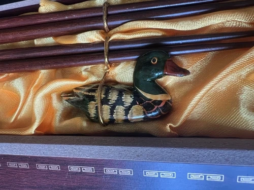 Vintage boxed decorated wooden chopsticks and rests depicting scenes of ancient China. The set showcases intricate designs reflecting Chinese culture, perfect for adding a touch of tradition to your dining experience. Made in China, these collectibles provide a glimpse into the artistry and craftsmanship of Chinese chopstick culture. A unique addition to any Asian or Chinese-themed collection, these non-handmade items offer a glimpse into the rich history and heritage of China.