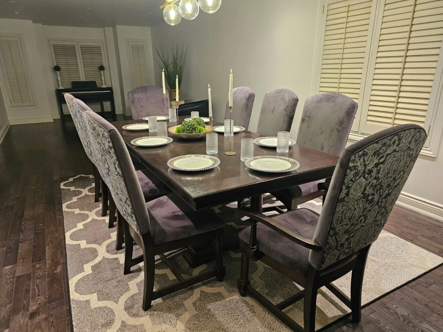 Selling a dining table with 8 matching velvet chairs. The chairs are a beautiful grey colour and in great condition. Also all chairs are custom made.