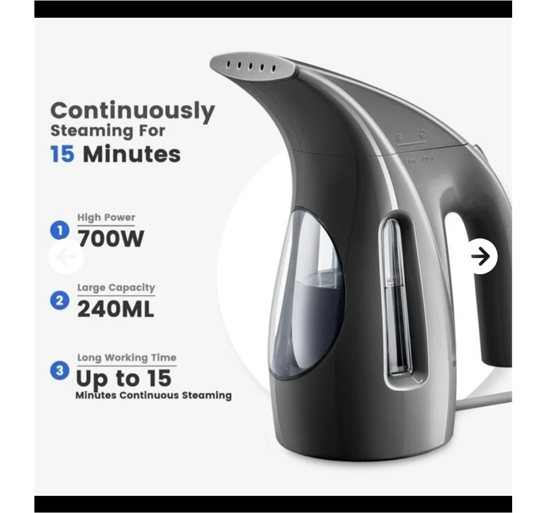 - The HiLIFE Steamer for Clothes is a convenient and efficient handheld garment steamer designed for quick wrinkle removal at home, in the office, or on the go. Featuring a 240ml large water tank and a powerful 700W heating system, it produces strong, penetrating steam that smooths out clothes fast without the need for an ironing board. Its portable, lightweight design makes it perfect for travel, and the ergonomic handle ensures comfortable use. This compact fabric steamer is suitable for a variety of fabrics, helping refresh garments, curtains, and linens with ease. Note: for use with 120V outlets only. Comes in sleek black for a modern, professional look.