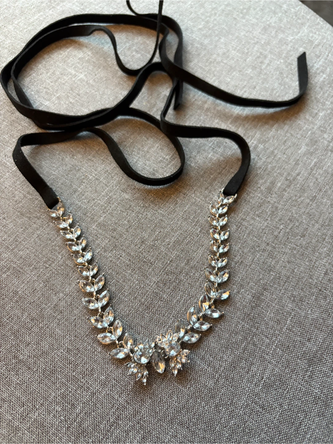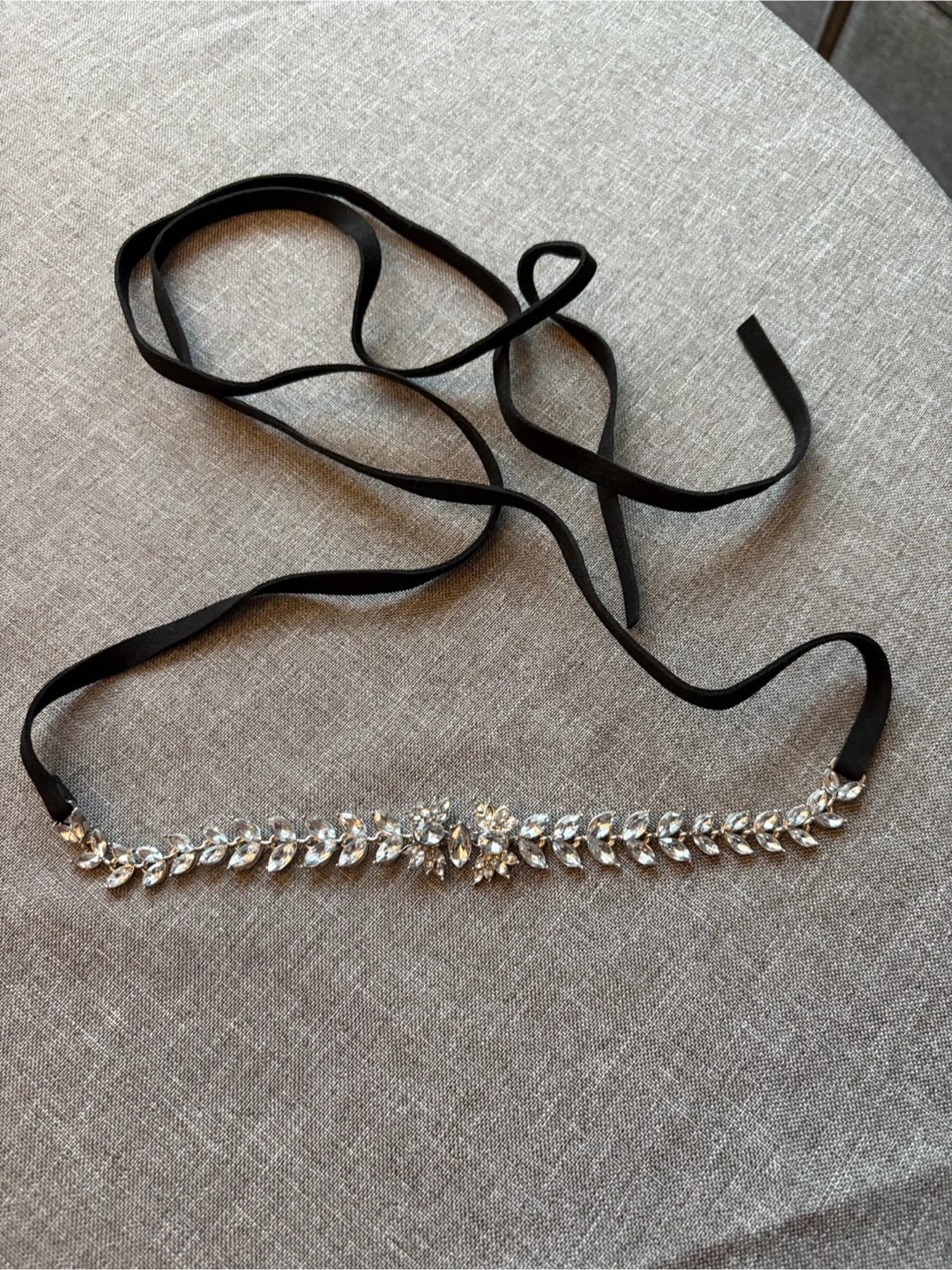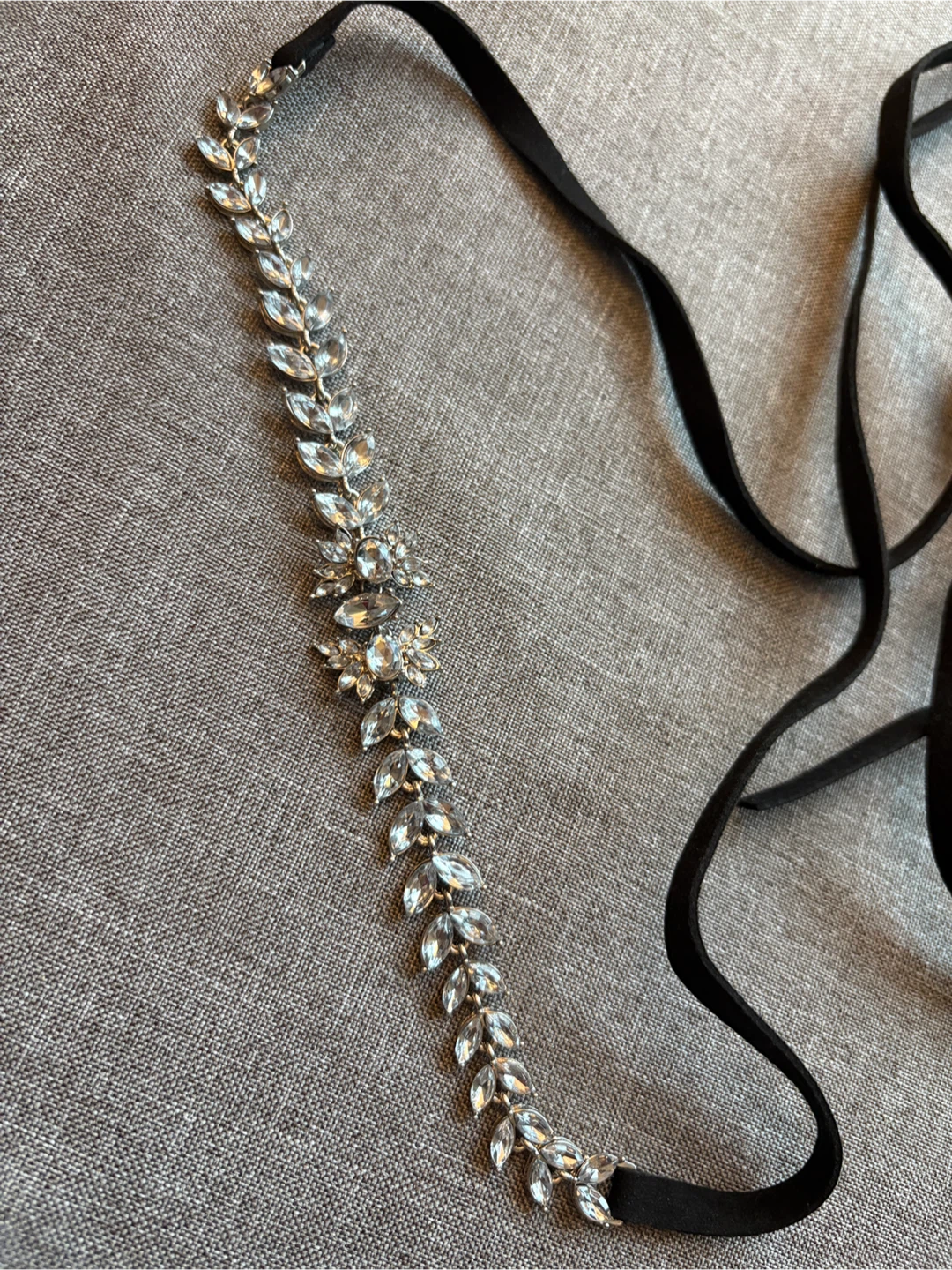 Selling a brand new rhinestone belt! It features a delicate leaf design with sparkling rhinestones. The belt has a black ribbon tie, making it adjustable to fit various waist sizes.