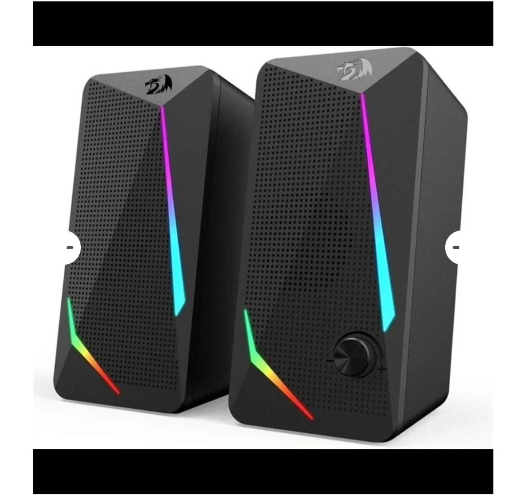 - Upgrade your desktop audio experience with the Redragon GS510 RGB Desktop Speakers. Designed with 2.0 channel stereo sound, these compact yet powerful speakers deliver clear and dynamic audio, enhanced by rich bass for a more immersive listening experience. The RGB lighting features 4 colorful LED backlight modes, adding vibrant style to your gaming setup or workspace. Easily adjust the volume with the front-facing control knob for quick access. Powered by USB and equipped with a 3.5mm audio cable, the GS510 connects effortlessly to your PC, laptop, or other compatible devices without the need for extra drivers or power adapters—making it both stylish and convenient for everyday use.