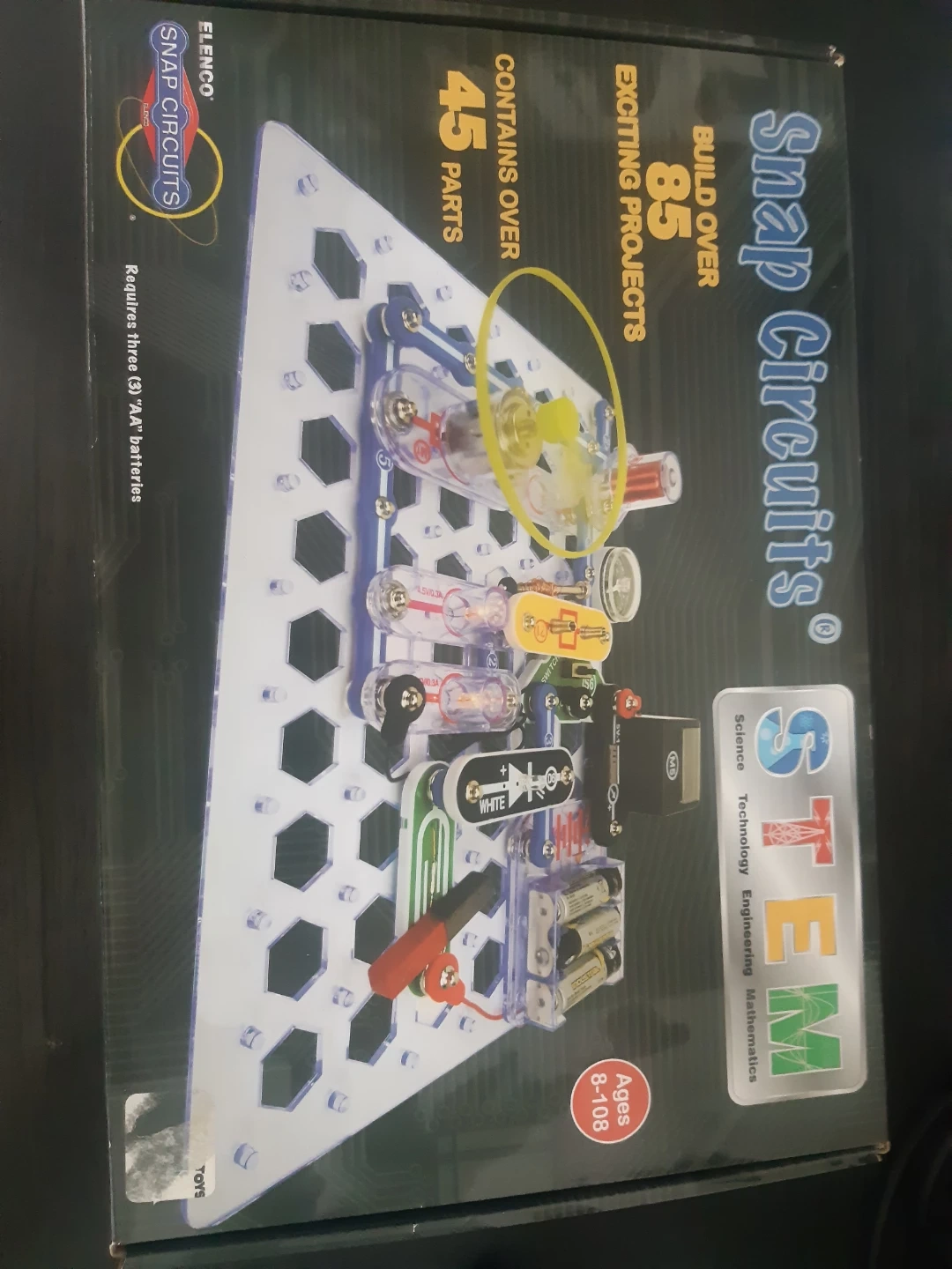 Selling a Snap Circuits STEM kit by Elenco! It's a fun way to learn about electronics and build over 85 exciting projects. The kit contains over 45 parts and includes one large base grid. Recommended for ages 8-108. Requires three (3) "AA" batteries.