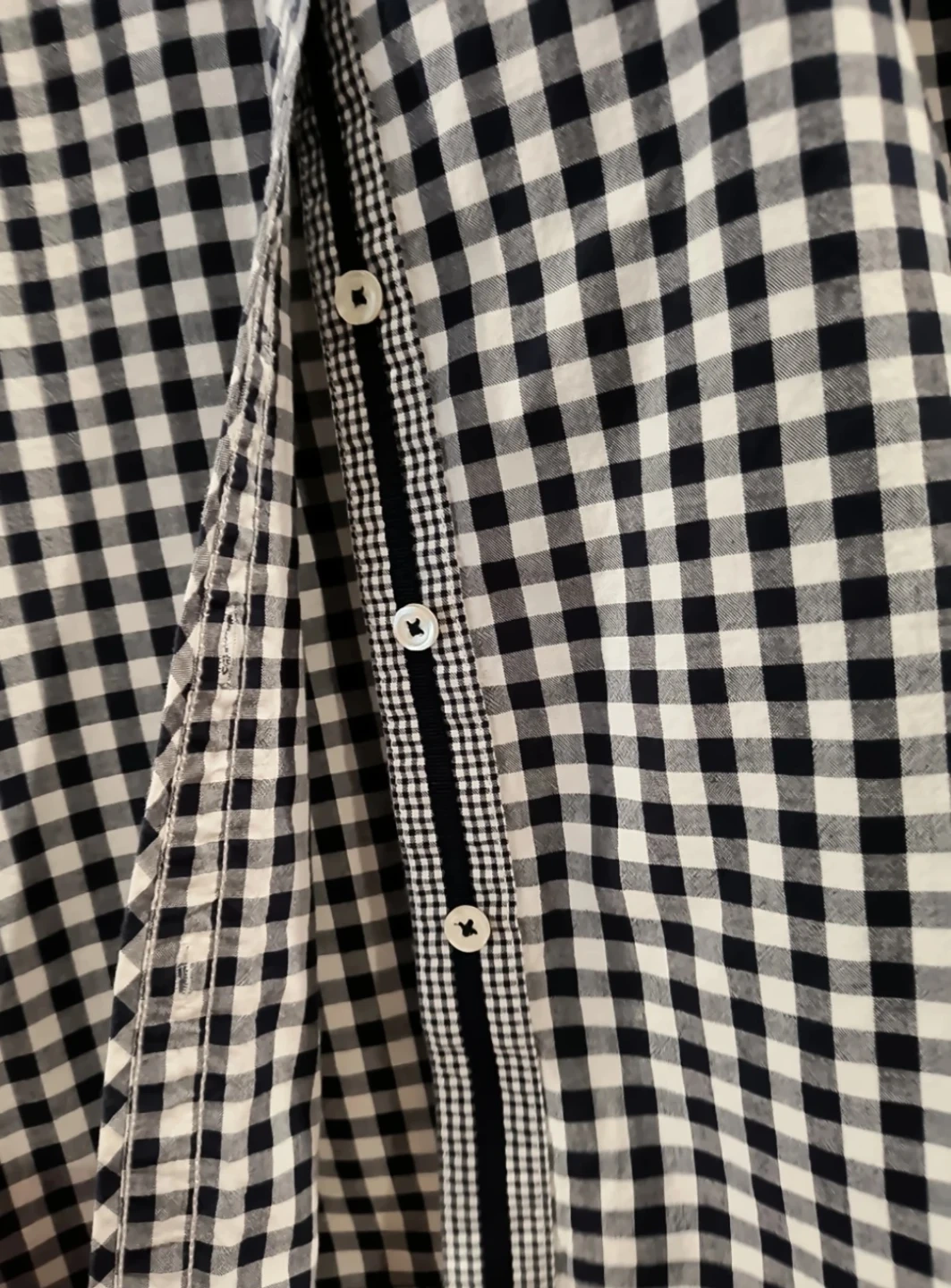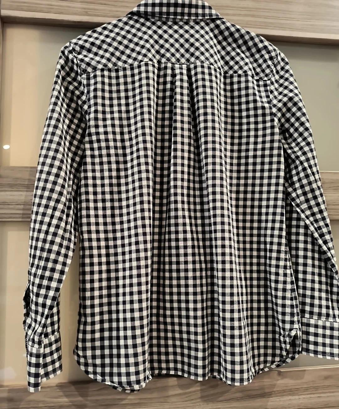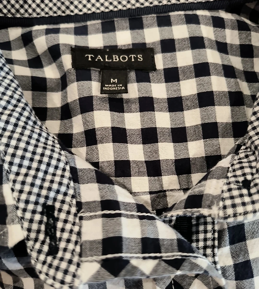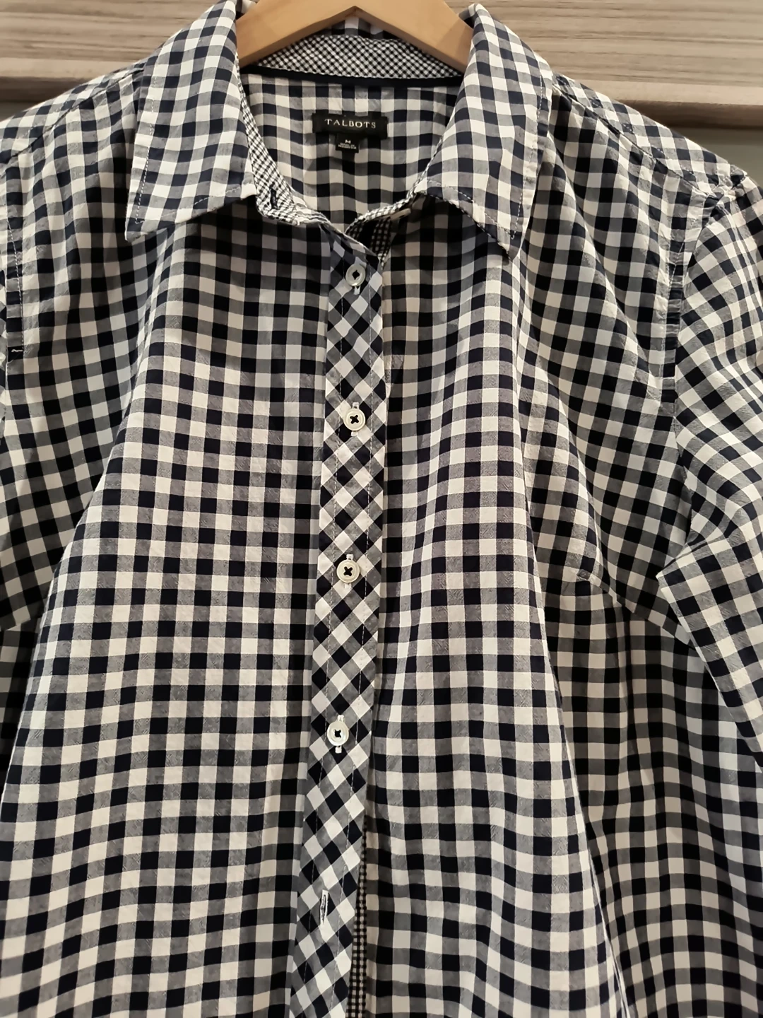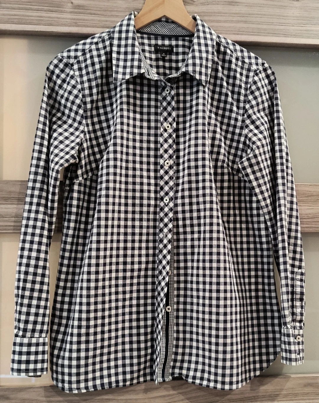 Here's a Talbots button-down shirt in a classic black and white gingham pattern! It's a size M and made of a comfortable material. Perfect for a casual or dressed-up look