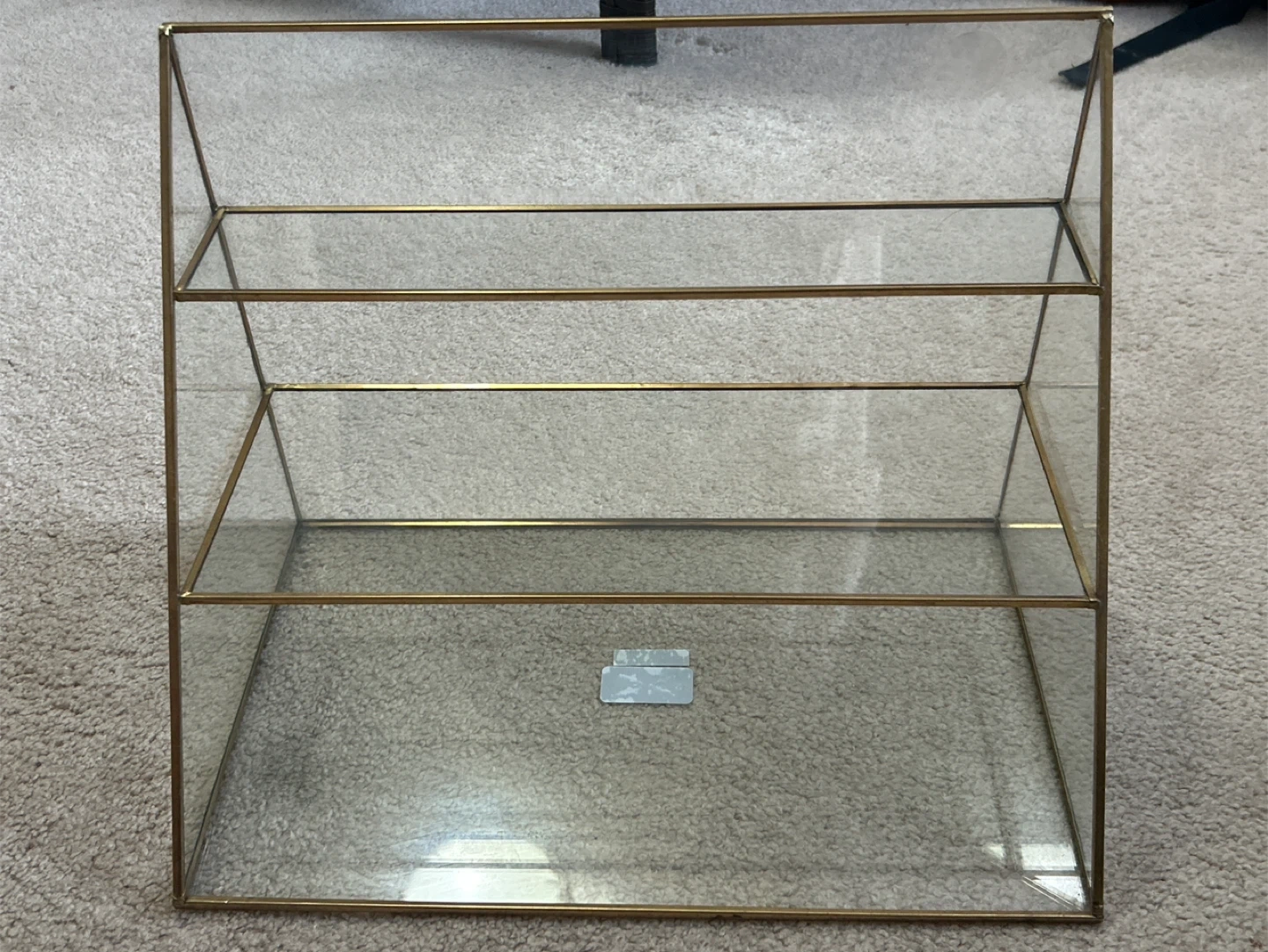 26Selling a tiered display shelf with a glass and brass design. It's in great shape and ready to add some style to your space! Perfect for displaying small items or adding a touch of elegance to any room